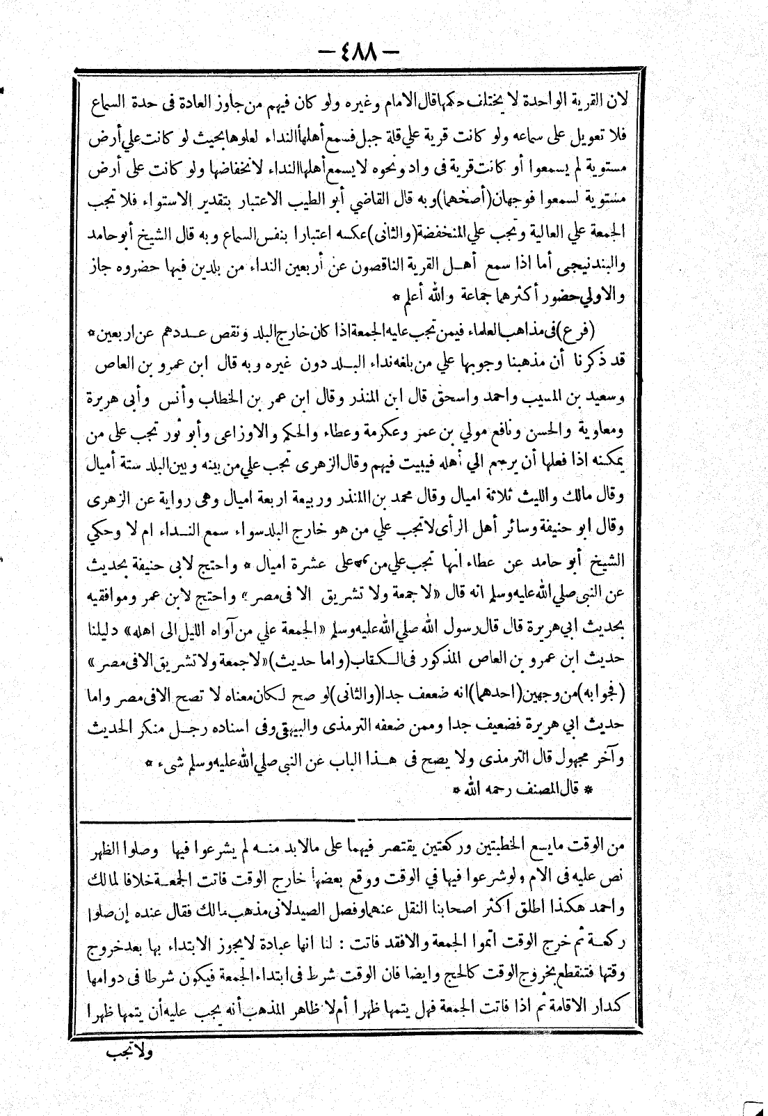 من الوقت ما يسع الخطبتين وركعتين يقتصر فيهما على ما لا بد منه لم يشرعوا فيها وصلوا الظهر نص عليه في الام ولو شرعوا فيها في الوقت ووقع بعضها خارج الوقت فاتت الجمعة خلافا لمالك واحمد هكذا اطلق اكثر اصحابنا النقل عنهما وفصل الصيدلانى مذهب مالك فقال عنده إن صلوا ركعة ثم خرج الوقت اتموا الجمعة والا فقد فاتت: لنا انها عبادة لا يجوز الابتداء بها بعد خروج وقتها فتنقطع بخروج الوقت كالحج وايضا فان الوقت شرط في ابتداء الجمعة فيكون شرطا في دوامها كدار الاقامة ثم إذا فاتت الجمعة فهل يتمها ظهرا أم لا ظاهر المذهب أنه يجب عليه أن يتمها ظهرا