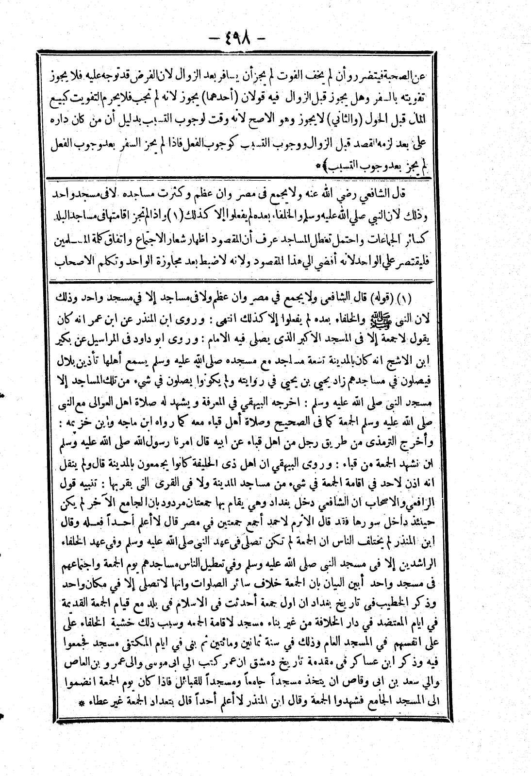 قال الشافعي رضي الله عنه ولا يجمع في مصر وان عظم وكثرت مساجده لا في مسجد واحد وذلك لان النبي صلي الله عليه وسلم والخلفاء بعده لم يفعلوا إلا كذلك وإذا لم تجز اقامتها في مساجد البلد كسائر الجماعات واحتمل تعطل المساجد عرف أن المقصود اظهار شعار الاجتماع واتفاق كلمة المسلمين فليقتصر علي الواحد لانه أفضي الي هذا المقصود ولانه لا ضبط بعد مجاوزة الواحد وتكلم الاصحاب