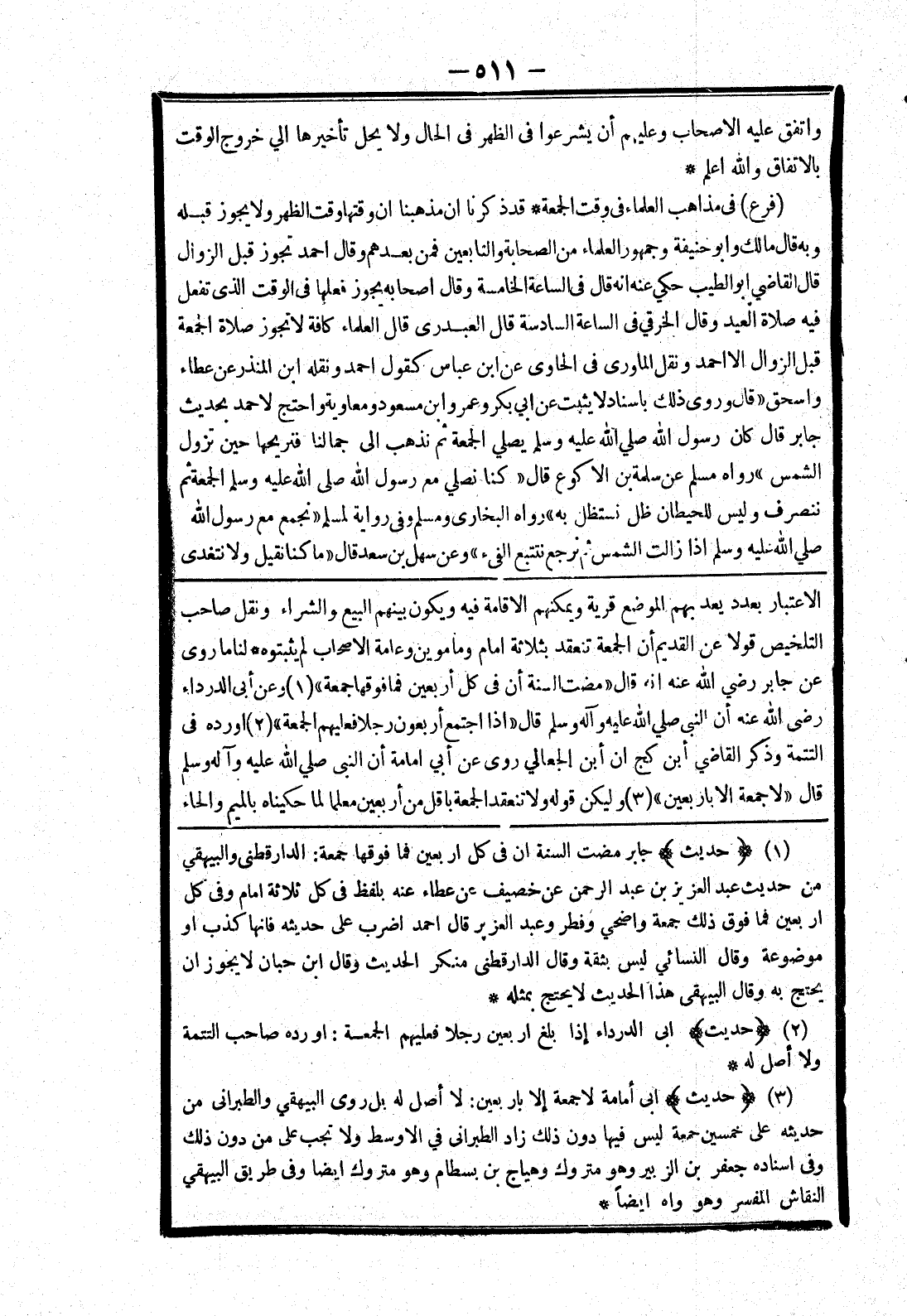 الاعتبار بعدد يعد بهم الموضع قرية ويمكنهم الاقامة فيه ويكون بينهم البيع والشراء ونقل صاحب التلخيص قولا عن القديم أن الجمعة تنعقد بثلاثة امام ومامومين وعامة الاصحاب لم يثبتوه * لنا ما روى عن جابر رضي الله عنه انه قال " مضت السنة أن في كل أربعين فما فوقها جمعة " وعن أبى الدرداء رضى الله عنه أن النبي صلي الله عليه وسلم قال " إذا اجتمع أربعون رجلا فعليهم الجمعة " اورده في التتمة وذكر القاضي أبن كج ان الحناطي روى عن أبي امامة أن النبي صلي الله عليه وسلم قال " لا جمعة الا باربعين " وليكن قوله ولا تنعقد الجمعة باقل من أربعين معلما لما حكيناه بالميم والحاء