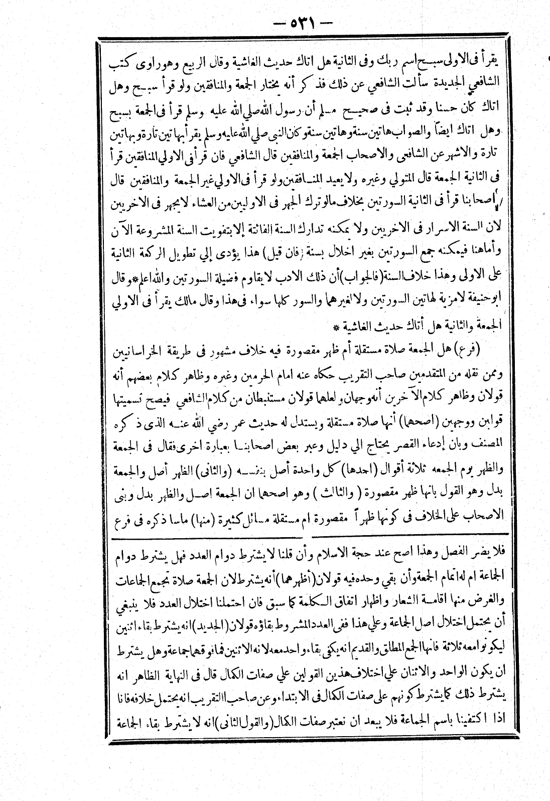 فلا يضر الفصل وهذا اصح عند حجة الاسلام وأن قلنا لا يشترط دوام العدد فهل يشترط دوام الجماعة ام له اتمام الجمعة وأن بقي وحده فيه قولان (أظهرهما) أنه يشترط لان الجمعة صلاة تجمع الجماعات والغرض منها اقامة الشعار واظهار اتفاق الكلمة كما سبق فان احتملنا اختلال العدد فلا ينبغي أن يحتمل اختلال اصل الجماعة وعلي هذا ففى العدد المشروط بقاؤه قولان (الجديد) انه يشترط بقاء اثنين ليكونوا معه ثلاثة فانها الجمع المطلق والقديم انه يكفى بقاء واحد معه لانه الاثنين فما فوقهما جماعة وهل يشترط ان يكون الواحد والاثنان علي اختلاف هذين القولين علي صفات الكمال قال في النهاية الظاهر انه يشترط ذلك كما يشترط كونهم على صفات الكمال في الابتداء وعن صاحب التقريب انه يحتمل خلافه فانا إذا اكتفينا باسم الجماعة فلا يبعد ان نعتبر صفات الكمال (والقول الثاني) انه لا يشترط بقاء الجماعة