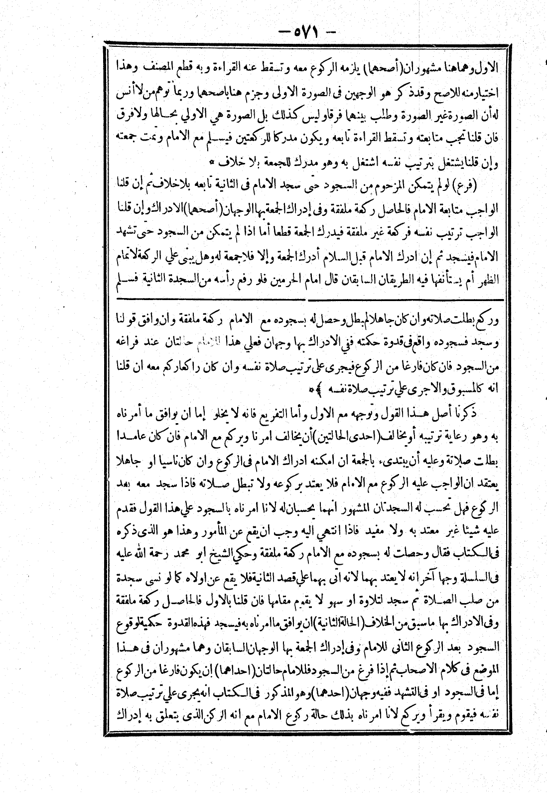 وركع بطلت صلاته وان كان جاهلا لم تبطل وحصل له بسجوده مع الامام ركعة ملفقة وان وافق قولنا وسجد فسجوده واقع في قدوة حكمته ففي الادراك بها وجهان فعلي هذا للامام حالتان عند فراغه من السجود فان كان فارغا من الركوع فيجرى على ترتيب صلاة نفسه وان كان راكعا ركع معه ان قلنا انه كالمسبوق والاجرى علي ترتيب صلاة نفسه) * ذكرنا أصل هذا القول وتوجهه مع الاول وأما التفريع فانه لا يخلو إما ان يوافق ما أمرناه به وهو رعاية ترتيبه أو يخالف (احدى الحالتين) أن يخالف امرنا ويركع مع الامام فان كان عامدا بطلت صلاته وعليه أن يبتدئ بالجمعة ان امكنه ادراك الامام في الركوع وان كان ناسيا أو جاهلا يعتقد ان الواجب عليه الركوع مع الامام فلا يعتد بركوعه ولا تبطل صلاته فإذا سجد معه بعد الركوع فهل تحسب له السجدتان المشهور انهما يحسبان له لانا امرناه بالسجود علي هذا القول فقدم عليه شيئا غير معتد به ولا مفيد فإذا انتهي إليه وجب ان يقع عن المأمور وهذا هو الذى ذكره في الكتاب فقال وحصلت له بسجوده مع الامام ركعة ملفقة وحكي الشيخ أبو محمد رحمة الله عليه في السلسلة وجها آخر انه لا يعتد بهما لانه اتى بهما على قصد الثانية فلا يقع عن اولاه كما لو نسى سجدة من صلب الصلاة ثم سجد لتلاوة أو سهو لا يقوم مقامها فان قلنا بالاول فالحاصل ركعة ملفقة وفى الادراك بها ما سبق من الخلاف (الحالة الثانية) ان يوافق ما امرناه به فيسجد فهذه القدوة حكمية لوقوع السجود بعد الركوع الثاني للامام وفى إدراك الجمعة بها الوجهان السابقان وهما مشهوران في هذا الموضع في كلام الاصحاب ثم إذا فرغ من السجود فللامام حالتان (احداهما) ان يكون فارغا من الركوع