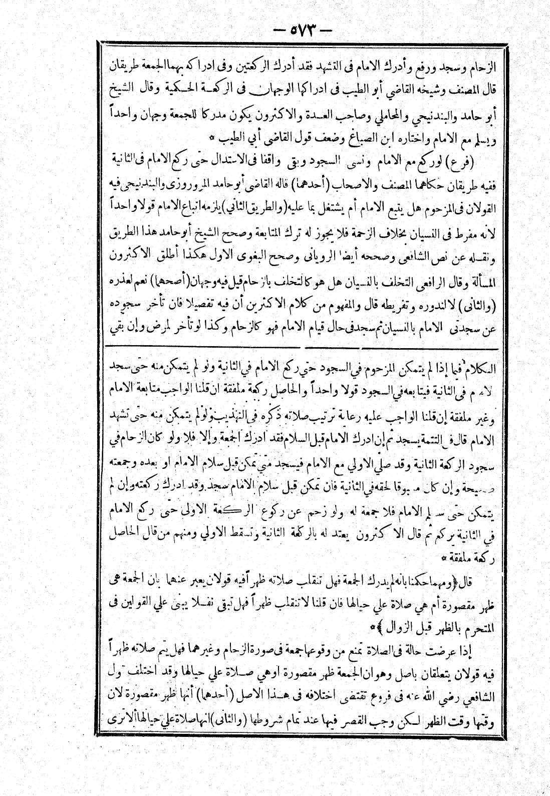 الكلام فيما إذا لم يتمكن المزحوم في السجود حتي ركع الامام في الثانية ولو لم يتمكن منه حتى سجد لامام في الثانية فيتابعه في السجود قولا واحدا والحاصل ركعة ملفقة ان قلنا الواجب متابعة الامام وغير ملفقة إن قلنا الواجب عليه رعاية ترتيب صلاته ذكره في التهذيب ولو لم يتمكن منه حتى تشهد الامام قال في التتمة يسجد ثم إن ادرك الامام قبل السلام فقد ادرك الجمعة وإلا فلا ولو كان الزحام في سجود الركعة الثانية وقد صلي الاولي مع الامام فيسجد متي تمكن قبل سلام الامام أو بعده وجمعته صحيحة وإن كان مسبوقا لحقه في الثانية فان تمكن قبل سلام الامام سجد وقد ادرك ركعته وإن لم يتمكن حتى سلم الامام فلا جمعة له ولو زحم عن ركوع الركعة الاولى حتى ركع الامام في الثانية يركع ثم قال الاكثرون يعتد له بالركعة الثانية وتسقط الاولي ومنهم من قال الحاصل ركعة ملفقة * قال (ومهما حكمنا بانه لم يدرك الجمعة فهل تنقلب صلاته ظهرا فيه قولان يعبر عنهما بان الجمعة هي ظهر مقصورة أم هي صلاة علي حيالها فان قلنا لا تنقلب ظهرا فهل تبقى نفلا يبنى علي القولين في المتحرم بالظهر قبل الزوال) * إذا عرضت حالة في الصلاة تمنع من وقوعها جمعة في صورة الزحام وغيرهما فهل يتم صلاته ظهرا فيه قولان يتعلقان باصل وهو ان الجمعة ظهر مقصورة أو هي صلاة علي حيالها وقد اختلف قول الشافعي رضي الله عنه في فروع تقتضي اختلافه في هذا الاصل (أحدهما) أنها ظهر مقصورة لان وقتها وقت الظهر لكن وجب القصر فيها عند تمام شروطها (والثانى) انها صلاة علي حيالها ألا ترى
