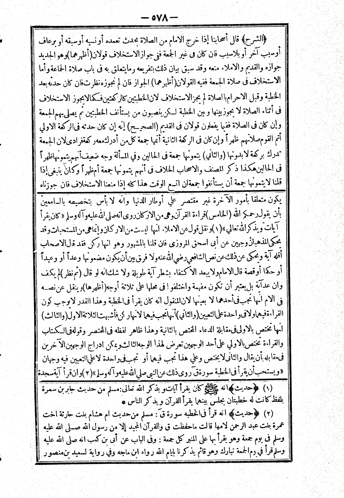 يكون متعلقا بامور الآخرة غير مقتصر علي أوطار الدنيا وانه لا بأس بتخصيصه بالسامعين بأن يقول رحمكم الله (الخامس) قراءة القرآن وهى من الاركان روى انه صلى الله عليه وسلم " كان يقرأ آيات ويذكر الله تعالي " ونقل قول عن الاملاء انها ليست من الاركان وإنما هي من المستحبات وقد يحكى المذهبان وجهين عن أبى اسحق المروزى فان قلنا بالمشهور وهو انها ركن فقد قال الاصحاب أقله آية ويحكى عن ذلك عن نص الشافعي رضي الله عنه ولا فرق بين أن يكون مضمونها وعدا أو وعيدا أو حكما أو قصة قال الامام ولا يبعد الاكتفاء بشطر آية طويلة ولا شك انه لو قال (ثم نظر) لم يكف وان عد آية بل يعتبر أن تكون مفهمة واختلفوا في محلها على ثلاثة أوجه (أظهرها) وينقل عن نصه في الام انها تجب في أحدهما لا بعينها لان المنقول انه كان يقرأ في الخطبة وهذا القدر لا يوجب كون القراءة فيهما ولا في واحدة على التعيين (والثاني) أنها تجب فيهما لانها ركن فأشبهت الثلاثة الاول (والثالث) انها تختص بالاولى في مقابلة الدعاء المختص بالثانية وهذا ظاهر لفظه في المختصر وقوله في الكتاب والقراءة تختص بالاولي على أحد الوجهين تعرض لهذا الوجه الثالث ويمكن ادراج الوجهين الآخرين في مقابله بأن يقال والثانى لا يختص وعلي هذا تجب فيهما أو تجب في واحدة لا علي التعيين فيه وجهان " ويستحب أن يقرأ في الخطبة سورة ق روى ذلك عن النبي صلي الله عليه وسلم وسلم " وان قرأ آية سجدة