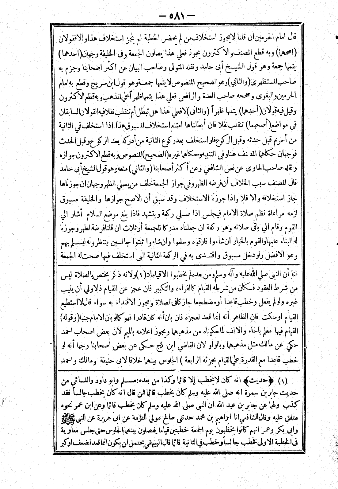 لنا أن النبي صلي الله عليه وسلم ومن بعده لم يخطبوا الا قياما " ولانه ذكر يختص بالصلاة ليس من شرطه القعود فكان من شرطه القيام كالقراءة والتكبير فان عجز عن القيام فالاولي أن ينيب غيره ولو لم يفعل وخطب قاعدا أو مضطجعا جاز كما في الصلاة ويجوز الاقتداء به سواء قال لا استطيع القيام أو سكت فان الظاهر أنه انما قعد لعجزه فان بان أنه كان قادرا فهو كما لو بان الامام جنبا (وقوله) القيام فيها معلم بالحاء والالف لما حكيناه من مذهبهما ويجوز اعلامه بالميم لان بعض اصحاب احمد حكي عن مالك مثل مذهبهما وبالواو لان القاضي ابن كج حكى عن بعض اصحابنا وجها أنه لو خطب قاعدا مع القدرة علي القيام يجزئه الرابعة) الجلوس بينهما خلافا لابي حنيفة ومالك واحمد