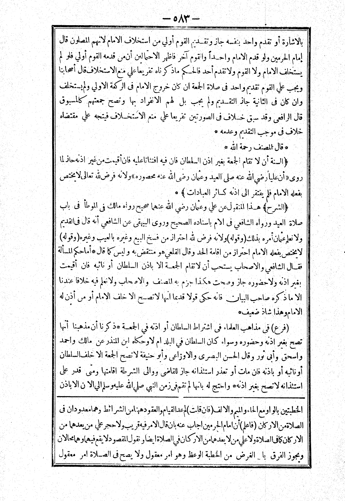 الخطبتين بالواو مع الحاء والميم والالف (فان قلت) لم عد القيام والقعود ههنا من الشرائط وهما معدودان في الصلاة من الاركان (فاعلم) أن امام الحرمين اجاب عنه بان قال الامر فيه قريب ولا حجر علي من يعدهما من الاركان كما في الصلاة ولا علي من لا يعدهما من الاركان في الصلاة ايضا ونقول المقصود لا يقع فيهما وهما محالان ويجوز الفرق بل الغرض من الخطبة الوعظ وهو امر معقول ولا يصح في الصلاة امر معقول