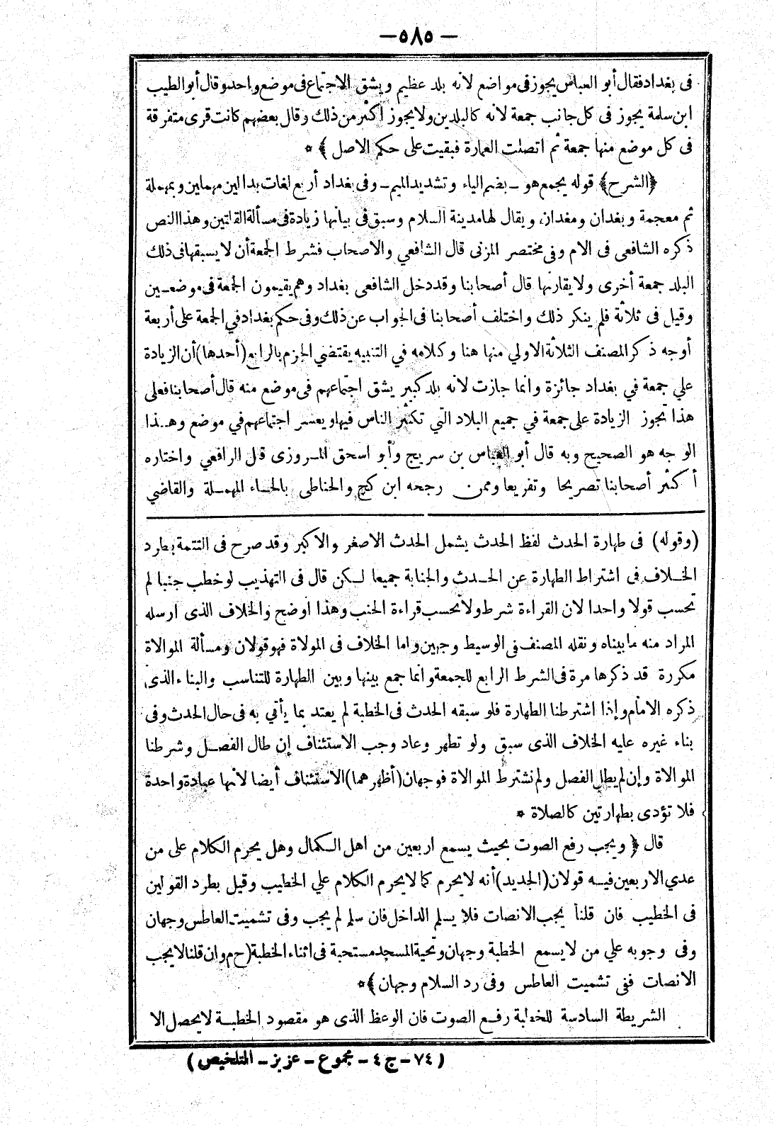 الموالاة وإن لم يطل الفصل ولم نشترط الموالاة فوجهان (أظهرهما) الاستئناف أيضا لانها عبادة واحدة فلا تؤدى بطهارتين كالصلاة * قال (ويجب رفع الصوت بحيث يسمع اربعين من اهل الكمال وهل يحرم الكلام على من عدي الاربعين فيه قولان (الجديد) أنه لا يحرم كما لا يحرم الكلام علي الخطيب وقيل بطرد القولين في الخطيب فان قلنا يجب الانصات فلا يسلم الداخل فان سلم لم يجب وفى تشميت العاطس وجهان وفى وجوبه علي من لا يسمع الخطبة وجهان وتحية المسجد مستحبة في اثناء الخطبة (ح م وان قلنا لا يجب الانصات ففى تشميت العاطس وفى رد السلام وجهان) * الشريطة السادسة للخطبة رفع الصوت فان الوعظ الذى هو مقصود الخطبة لا يحصل الا