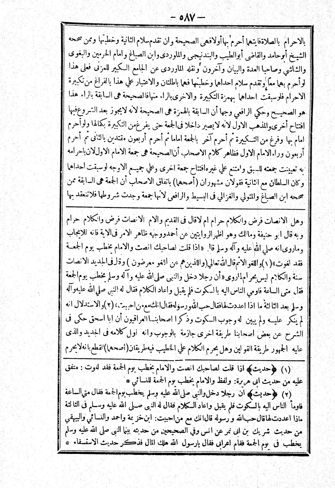 سنة والكلام ليس بحرام لما روى " أن رجلا دخل والنبى صلى الله عليه وسلم يخطب يوم الجمعة فقال متى الساعة فاومي الناس إليه بالسكوت فلم يقبل واعاد الكلام فقال له النبي صلي الله عليه وسلم وسلم بعد الثالثة ما إذا اعددت لها فقال حب الله ورسوله فقال انك مع من احببت " والاستدلال انه لم ينكر عليه ولم يبين له وجوب السكوت وذكر اصحابنا العراقيون أن ابا اسحق حكى في الشرح عن بعض اصحابنا طريقة اخرى جازمة بالوجوب وانه اول كلامه في الجديد والذى عليه الجمهور طريقة القولين وهل يحرم الكلام علي الخطيب فيه طريقان (اصحهما) القطع بانه لا يحرم