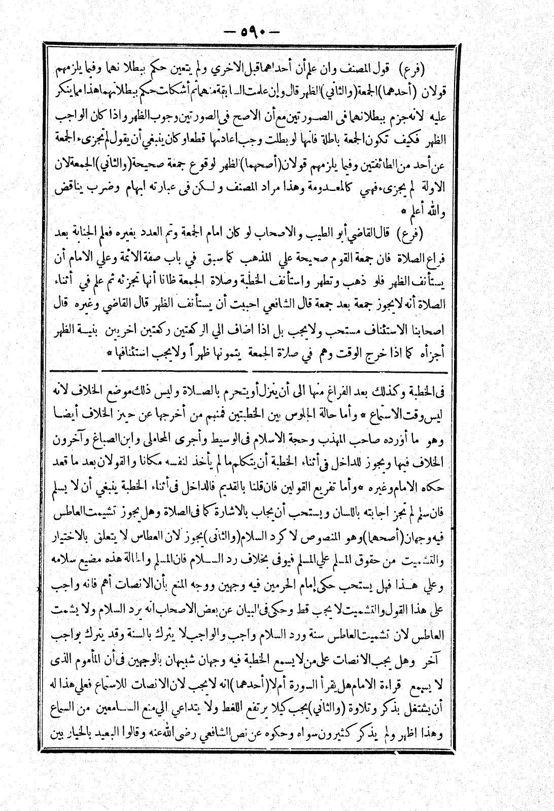في الخطبة وكذلك بعد الفراغ منها إلى أن ينزل أو يتحرم بالصلاة وليس ذلك موضع الخلاف لانه ليس وقت الاستماع * وأما حالة الجلوس بين الخطبتين فمنهم من أخرجها عن حيز الخلاف أيضا وهو ما أورده صاحب المهذب وحجة الاسلام في الوسيط وأجرى المحاملى وابن الصباغ وآخرون