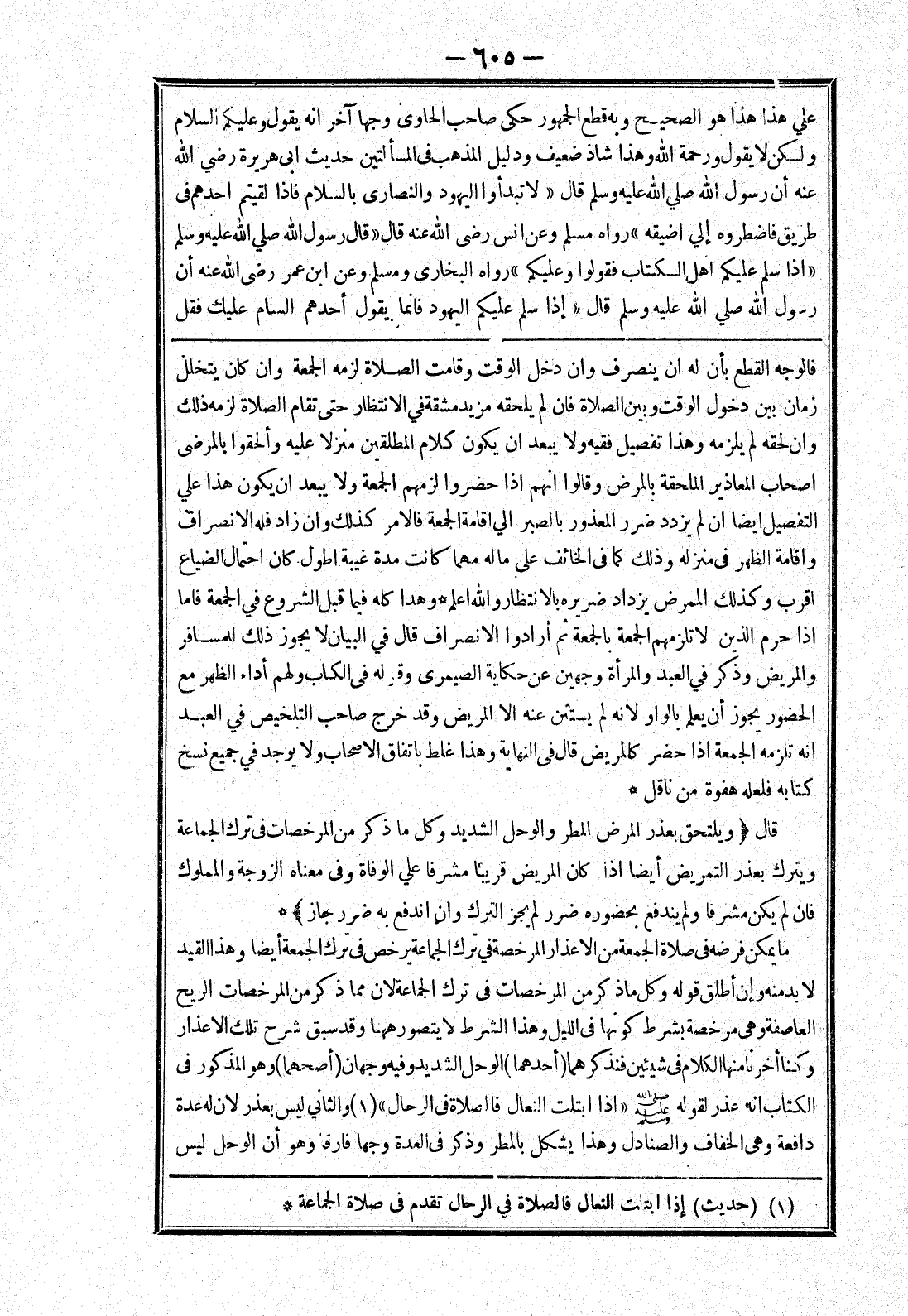 انه تلزمه الجمعة إذا حضر كالمريض قال في النهاية وهذا غلط باتفاق الاصحاب ولا يوجد في جميع نسخ كتابه فلعله هفوة من ناقل * قال (ويلتحق بعذر المرض المطر والوحل الشديد وكل ما ذكر من المرخصات في ترك الجماعة ويترك بعذر التمريض أيضا إذا كان المريض قريبا مشرفا علي الوفاة وفى معناه الزوجة والمملوك فان لم يكن مشرفا ولم يندفع بحضوره ضرر لم يجز الترك وان اندفع به ضرر جاز) * ما يمكن فرضه في صلاة الجمعة من الاعذار المرخصة في ترك الجماعة يرخص في ترك الجمعة أيضا وهذا القيد لا بد منه وإن أطلق قوله وكل ما ذكر من المرخصات في ترك الجماعة لان مما ذكر من المرخصات الريح العاصفة وهى مرخصة بشرط كونها في الليل وهذا الشرط لا يتصور ههنا وقد سبق شرح تلك الاعذار وكنا أخرنا منها الكلام في شيئين فنذكرهما (أحدهما) الوحل الشديد وفيه وجهان (أصحهما) وهو المذكور في الكتاب انه عذر لقوله صلى الله عليه وسلم " إذا ابتلت النعال فالصلاة في الرحال " والثاني ليس بعذر لان له عدة دافعة وهى الخفاف والصنادل وهذا يشكل بالمطر وذكر في العدة وجها فارقا وهو أن الوحل ليس