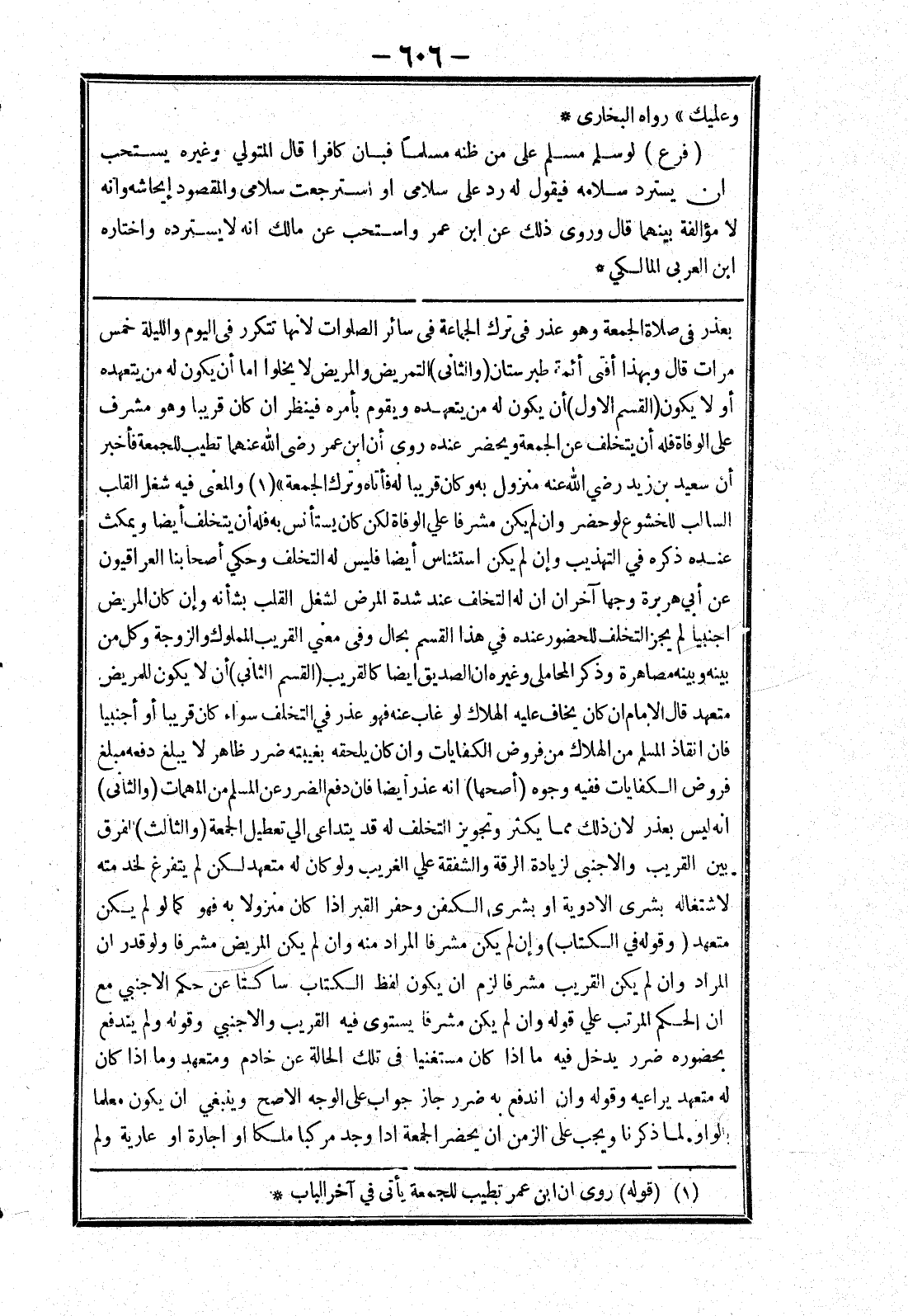 بعذر في صلاة الجمعة وهو عذر في ترك الجماعة في سائر الصلوات لانها تتكرر في اليوم والليلة خمس مرات قال وبهذا أفتى أئمة طبرستان (والثانى) التمريض والمريض لا يخلوا اما أن يكون له من يتعهده أو لا يكون (القسم الاول) أن يكون له من يتعهده ويقوم بأمره فينظر ان كان قريبا وهو مشرف على الوفاة فله أن يتخلف عن الجمعة ويحضر عنده روى أن ابن عمر رضى الله عنهما تطيب للجمعة فأخبر أن سعيد بن زيد رضي الله عنه منزول به وكان قريبا له فأتاه وترك الجمعة " والمعنى فيه شغل القلب السالب للخشوع لو حضر وان لم يكن مشرفا علي الوفاة لكن كان يستأنس به فله أن يتخلف أيضا ويمكث عنده ذكره في التهذيب وان لم يكن استئناس أيضا فليس له التخلف وحكي أصحابنا العراقيون عن ابن ابى هريرة وجها آخران ان له التخلف عند شدة المرض لشغل القلب بشأنه وإن كان المريض اجنبيا لم يجز التخلف للحضور عنده في هذا القسم بحال وفى معني القريب المملوك والزوجة وكل من بينه وبينه مصاهرة وذكر المحاملى وغيره ان الصديق ايضا كالقريب (القسم الثاني) أن لا يكون للمريض