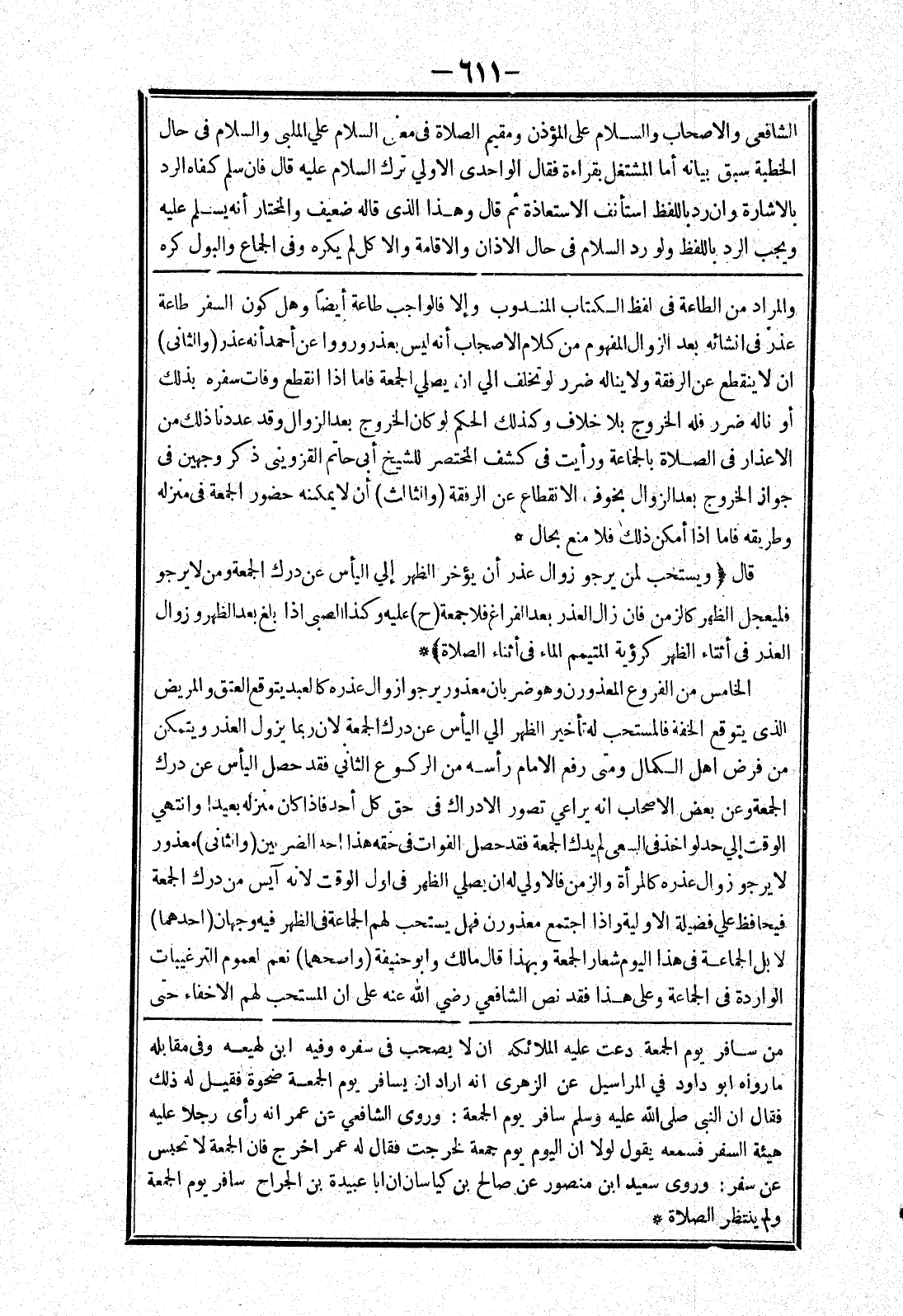 والمراد من الطاعة في لفظ الكتاب المندوب وإلا فالواجب طاعة أيضا وهل كون السفر طاعة عذر في انشائه بعد الزوال المفهوم من كلام الاصحاب أنه ليس بعذر ورووا عن أحمد أنه عذر (والثانى) ان لا ينقطع عن الرفقة ولا يناله ضرر لو تخلف الي ان يصلي الجمعة فاما إذا انقطع وفات سفره بذلك أو ناله ضرر فله الخروج بلا خلاف وكذلك الحكم لو كان الخروج بعد الزوال وقد عددنا ذلك من الاعذار في الصلاة بالجماعة ورأيت في كشف المختصر للشيخ أبى حاتم القزويني ذكر وجهين في جواز الخروج بعد الزوال بخوف الانقطاع عن الرفقة (والثالث) أن لا يمكنه حضور الجمعة في منزله وطريقه فاما إذا أمكن ذلك فلا منع بحال * قال (ويستحب لمن يرجو زوال عذر أن يؤخر الظهر إلي اليأس عن درك الجمعة ومن لا يرجو فليعجل الظهر كالزمن فان زال العذر بعد الفراغ فلا جمعة (ح) عليه وكذا الصبى إذا بلغ بعد الظهر وزوال العذر في أثناء الظهر كرؤية المتيمم الماء في أثناء الصلاة) * الخامس من الفروع المعذورن وهو ضربان معذور يرجوا زوال عذره كالعبد يتوقع العتق والمريض الذى يتوقع الخفة فالمستحب له تأخير الظهر الي اليأس عن درك الجمعة لان ربما يزول العذر ويتمكن من فرض اهل الكمال ومتى رفع الامام رأسه من الركوع الثاني فقد حصل اليأس عن درك