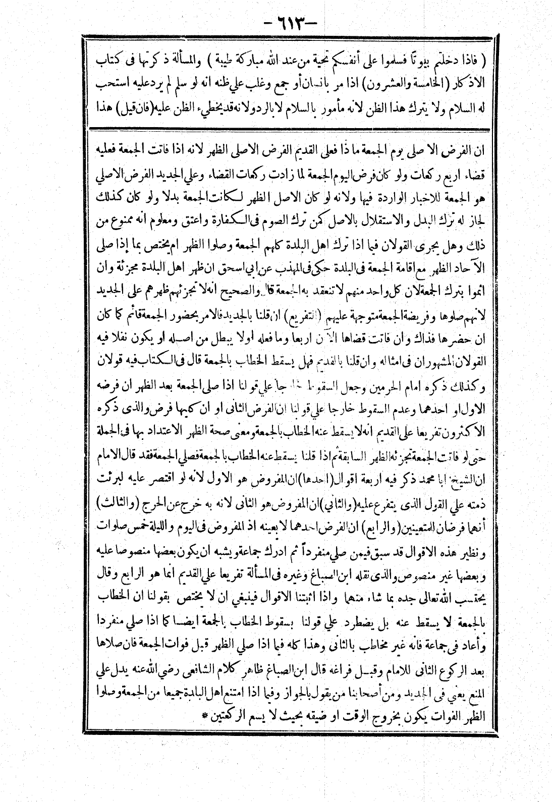 ذمته علي القول الذى يتفرع عليه (والثاني) ان المفروض هو الثاني لانه به خرج عن الحرج (والثالث) أنهما فرضان للمتعينين (والرابع) ان الفرض احدهما لا بعينه إذ المفروض في اليوم والليلة خمس صلوات ونظير هذه الاقوال قد سبق فيمن صلي منفردا ثم ادرك جماعة ويشبه ان يكون بعضها منصوصا عليه وبعضها غير منصوص والذى نقله ابن الصباغ وغيره في المسألة تفريعا علي القديم انما هو الرابع وقال يحتسب الله تعالى جده بما شاء منهما وإذا اثبتنا الاقوال فينبغي ان لا يختص بقولنا ان الخطاب بالجمعة لا يسقط عنه بل يضطرد علي قولنا بسقوط الخطاب بالجمعة ايضا كما إذا صلي منفردا وأعاد في جماعة فانه غير مخاطب بالثاني وهذا كله فيما إذا صلي الظهر قبل فوات الجمعة فان صلاها بعد الركوع الثاني للامام وقبل فراغه قال ابن الصباغ ظاهر كلام الشافعي رضي الله عنه يدل على المنع يعني في الجديد ومن أصحابنا من يقول بالجواز وفيما إذا امتنع اهل البلدة جميعا من الجمعة وصلوا الظهر الفوات يكون بخروج الوقت أو ضيقه بحيث لا يسع الركعتين *