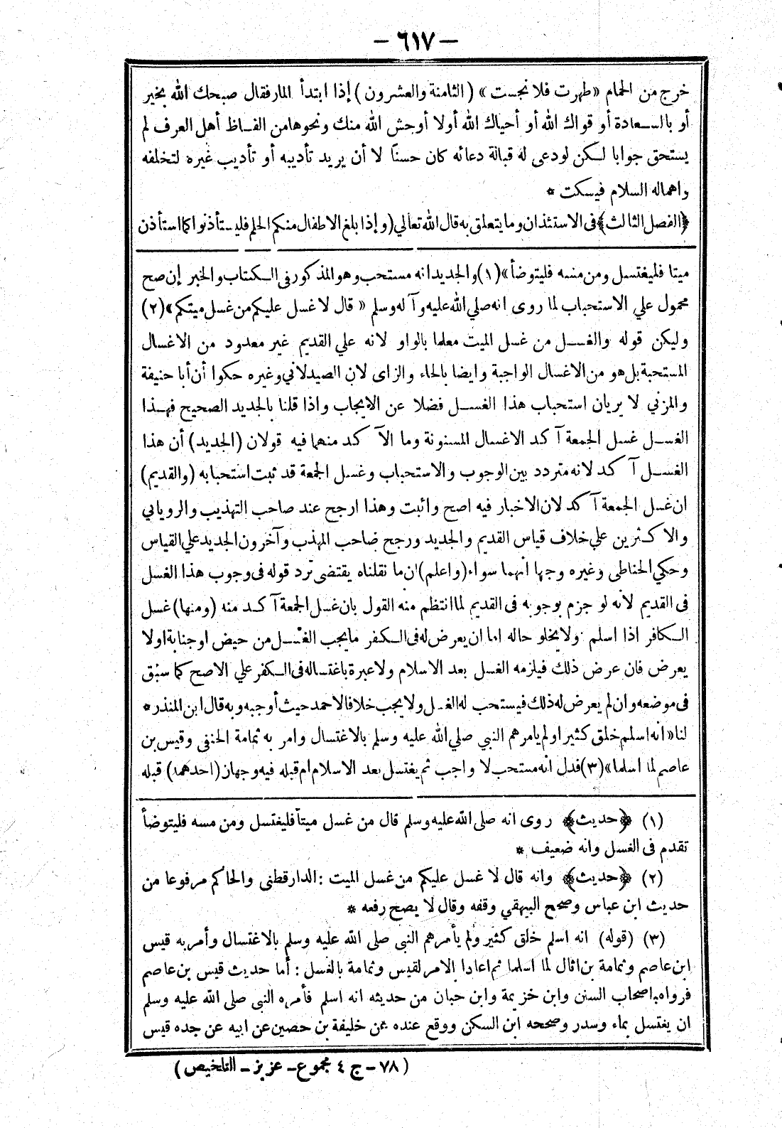 الغسل غسل الجمعة آكد الاغسال المسنونة وما الآكد منهما فيه قولان (الجديد) أن هذا الغسل آكد لانه متردد بين الوجوب والاستحباب وغسل الجمعة قد ثبت استحبابه (والقديم) ان غسل الجمعة آكد لان الاخبار فيه اصح وائبت وهذا ارجح عند صاحب التهذيب والروياني والاكثرين علي خلاف قياس القديم والجديد ورجح صاحب المهذب وآخرون الجديد علي القياس وحكي الحناطى وغيره وجها انهما سواء (واعلم) ان ما نقلناه يقتضى تردد قوله في وجوب هذا الغسل في القديم لانه لو جزم بوجوبه في القديم لما انتظم منه القول بان غسل الجمعة آكد منه (ومنها) غسل الكافر إذا اسلم ولا يخلو حاله اما ان يعرض له في الكفر ما يجب الغسل من حيض أو جنابة أو لا يعرض فان عرض ذلك فيلزمه الغسل بعد الاسلام ولا عبرة باغتساله في الكفر علي الاصح كما سبق في موضعه وان لم يعرض له ذلك فيستحب له الغسل ولا يجب خلافا لاحمد حيث أوجبه وبه قال ابن المنذر * لنا " انه اسلم خلق كثيرا ولم يامرهم النبي صلي الله عليه وسلم بالاغتسال وامر به ثمامة الحنفي وقيس بن عاصم لما اسلما " فدل انه مستحب لا واجب ثم يغتسل بعد الاسلام ام قبله فيه وجهان (احدهما) قبله