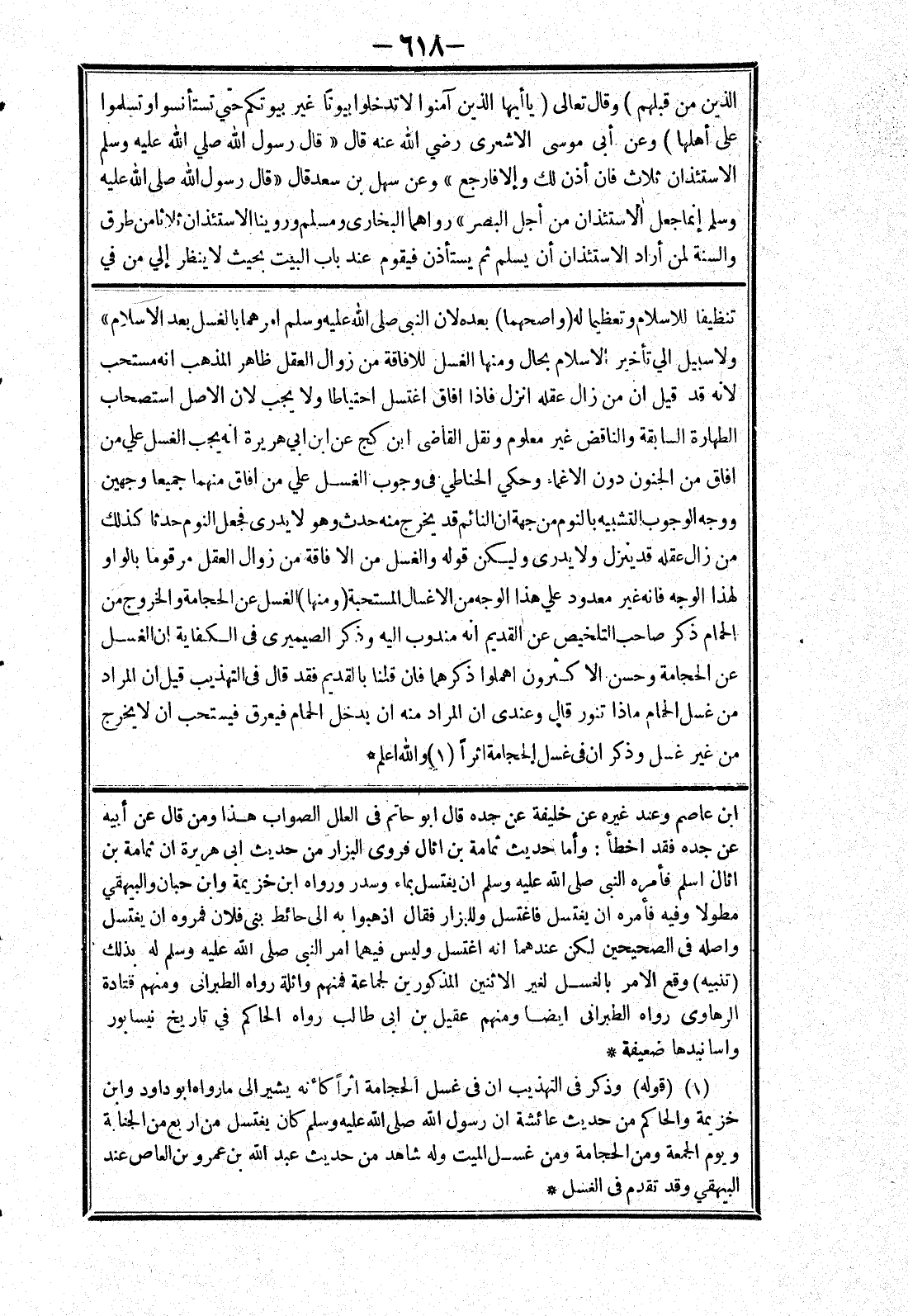 تنظيفا للاسلام وتعظيما (واصحهما) بعده لان النبي صلى الله عليه وسلم امرهما بالغسل بعد الاسلام " ولا سبيل الي تأخير الاسلام بحال ومنها الغسل للافاقة من زوال العقل ظاهر المذهب انه مستحب لانه قد قيل ان من زال عقله انزل فإذا افاق اغتسل احتياطا ولا يجب لان الاصل استصحاب الطهارة السابقة والناقض غير معلوم ونقل القاضى ابن كج عن ابن ابي هريرة انه يجب الغسل علي من افاق من الجنون دون الاغماء وحكي الحناطي في وجوب الغسل علي من افاق منهما جميعا وجهين ووجه الوجوب التشبيه بالنوم من جهة ان النائم قد يخرج منه حدث وهو لا يدرى فجعل النوم حدثا كذلك من زال عقله قد ينزل ولا يدرى وليكن قوله والغسل من الافاقة من زوال العقل مرقوما بالواو لهذا الوجه فانه غير معدود علي هذا الوجه من الاغسال المستحبة (ومنها) الغسل عن الحجامة والخروج من الحمام ذكر صاحب التلخيص عن القديم انه مندوب إليه وذكر الصيمري في الكفاية ان الغسل عن الحجامة وحسن الاكثرون اهملوا ذكرهما فان قلنا بالقديم فقد قال في التهذيب قيل ان المراد