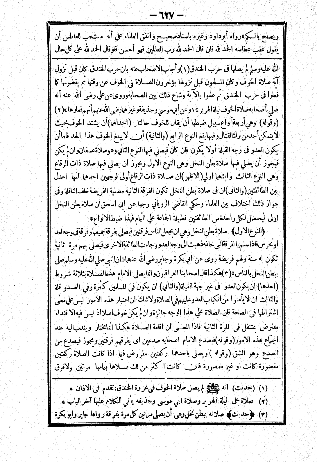 جواز ذلك اختلاف بين العلماء وحكي القاضي الروياني وجها عن ابى اسحق ان صلاة بطن النخل اولى ليحصل لكل واحدة من الطائفتين فضيلة الجماعة علي التمام فهذا ضبط الانواع * (النوع الاول) صلاة بطن النخل وهي ان يجعل الناس فرقتين فيصلى بفرقة جميعها وفرقة في وجه العد أو تحرس فإذا سلم بالفرقة التى خلفه ذهبت إلى وجه العدو وجاءت الطائفة الاخرى فيصلى بهم مرة ثانية تكون له سنة ولهم فريضة روى عن ابي بكرة وجابر رضي الله عنهما " ان النبي صلي الله عليه وسلم صلى ببطن النخل بالناس " هكذا قال اصحابنا العراقيون وانما يصلى الامام هذه الصلاة بثلاثة شروط (احدها) ان يكون العدو في غير جهة القبلة (والثاني) ان يكون في المسلمين كثرة وفي العدو قلة والثالث ان لا يأمنوا من انكباب العدو عليهم في الصلاة ولا شك ان اعتبار هذه الامور ليس علي معنى اشتراطها في الصحة فان الصلاة علي هذا الوجه جائزة وان لم يكن خوف اصلا إذ ليس فيه الاقتداء مفترض بمتنفل في المرة الثانية فإذا المعنى ان اقامة الصلاة هكذا انما يختار ويندب إليه عند اجتماع هذه الامور (وقوله) فيصدع الامام اصحابه صدعين أي يفرقهم فرقتين ويجوز فيصدع من الصدع وهو الشق (وقوله) ويصلي باحدهما ركعتين مفروض فيما إذا كانت الصلاة ركعتين مقصورة كانت أو غير مقصورة فان كانت اكثر من ذلك صلاها بتمامها مرتين ولا فرق