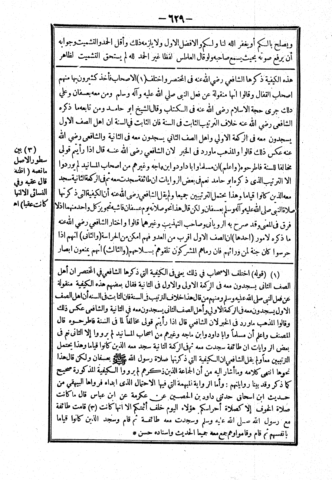 هذه الكيفية ذكرها الشافعي رضي الله عنه في المختصر واختلف الاصحاب فأخذ كثيرون بها منهم اصحاب القفال وقالوا انها منقولة عن فعل النبي صلي الله عليه وسلم ومن معه بعسفان وعلي ذلك جرى حجة الاسلام رضى الله عنه في الكتاب وقال الشيخ أبو حامد ومن تابعه ما ذكره الشافعي رضي الله عنه خلاف الترتيب الثابت في السنة فان الثابت في السنة ان اهل الصف الاول يسجدون معه في الركعة الاولي واهل الصف الثاني يسجدون معه في الثانية والشافعي رضي الله عنه عكس ذلك قالوا والمذهب ما ورد في الخبر لان الشافعي رضى الله عنه قال إذا رأيتم قولى مخالفا للسنة فاطرحوه (واعلم) ان مسلما وابا داود وابن ماجه وغيرهم من اصحاب المسانيد لم يوردوا الا الترتيب الذى ذكره أبو حامد نعم في بعض الروايات ان طائفة سجدت معه ثم في الركعة الثانية سجد معه الذين كانوا قياما وهذا يحتمل الترتيبين جميعا ولم يقل الشافعي رضى الله عنه أن الكيفية التى ذكرتها صلاة النبي صلى الله عليه وسلم بعسفان ولكن قال هذا نحو صلاته يوم عسفان فاشبه تجويز كل واحد منهما إذ لا فرق في المعنى وقد صرح به الرويانى وصاحب التهذيب وغيرهما قالوا واختار الشافعي رضي الله عنه ما ذكره لامور (احدها) ان الصف الاول اقرب من العدو فهم امكن من الحراسة (والثانى) انهم إذا حرسوا كان جنة لمن ورائهم فان رماهم المشركون تلقوهم بسلاحهم (والثالث) انهم يمنعون ابصار
