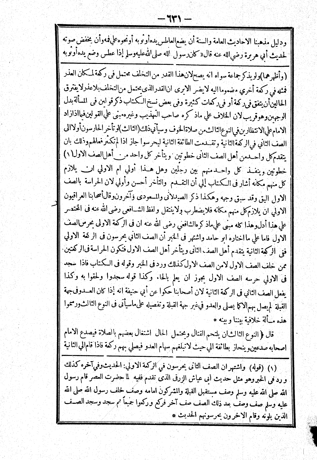 فمثله في ركعة أخري مضموما إليه لا يضر الا يرى ان القدر الذى يحتمل من التخلف بلا عذر لا يفترق الحالين أن يتفق في ركعة أو في ركعات كثيرة وفى بعض نسخ الكتاب ذكر قولين في المسألة بدل الوجهين وهو قريب لان الخلاف علي ما ذكره صاحب التهذيب وغيره مبنى علي القولين فيما إذا زاد الامام علي الانتظارين في النوع الثالث من صلاة الخوف وسيأتي ذلك (الثالث) لو تأخر الحارسون أولا إلى الصف الثاني في الركعة الثانية وتقدمت الطائفة الثانية ليحرسوا جاز إذا لم يكثر فعالهم وذلك بان يتقدم كل واحد من أهل الصف الثاني خطوتين ويتأخر كل واحد من أهل الصف الاول خطوتين وينفذ كل واحد منهم بين رجلين وهل هذا أولي ام الاولي ان يلازم كل منهم مكانه أشار في الكتاب إلي أن التقدم والتأخر أحسن وأولي لان الحراسة بالصف الاول اليق وقد سبق وجهه وهكذا ذكر الصيدلانى والمسعودي وآخرون وقال أصحابنا العراقيون الاولي ان يلازم كل منهم مكانه فلا يضطرب ولا ينتقل ولفظ الشافعي رضى الله عنه في المختصر علي هذا أدل وهذا كله مبنى علي ما ذكره الشافعي رضى الله عنه ان في الركعة الاولى يحرس الصف الاول فاما علي ما اختاره أبو حامد واشتهر في الخبر أن الصف الثاني يحرسون في الركعة الاولي ففى الركعة الثانية يتقدم أهل الصف الثاني ويتأخر أهل الصف الاول فتكون الحراسة في الركعتين ممن خلف الصف الاول لا من الصف الاول كذلك ورد في الخبر وقوله في الكتاب فإذا سجد في الاولي حرسه الصف الاول يجوز ان يعلم بالحاء وكذا قوله سجدوا ولحقوا به وكذا يفعل الصف الثاني في الركعة الثانية لان أصحابنا حكوا عن أبي حنيفة انه إذا كان العدو في جهة القبلة لم يصل بهم الا كما يصلى والعدو في غير جهة القبلة وتفصيله على ما سيأتي في النوع الثالث ورسموا هذه مسألة خلافية بيننا وبينه * قال (النوع الثالث ان يلتحم القتال ويحتمل الحال اشتغال بعضهم بالصلاة فيصدع الامام اصحابه صدعين وينحاز بطائفة الي حيث لا تبلغهم سهام العدو فيصلي بهم ركعة فإذا قام الي الثانية