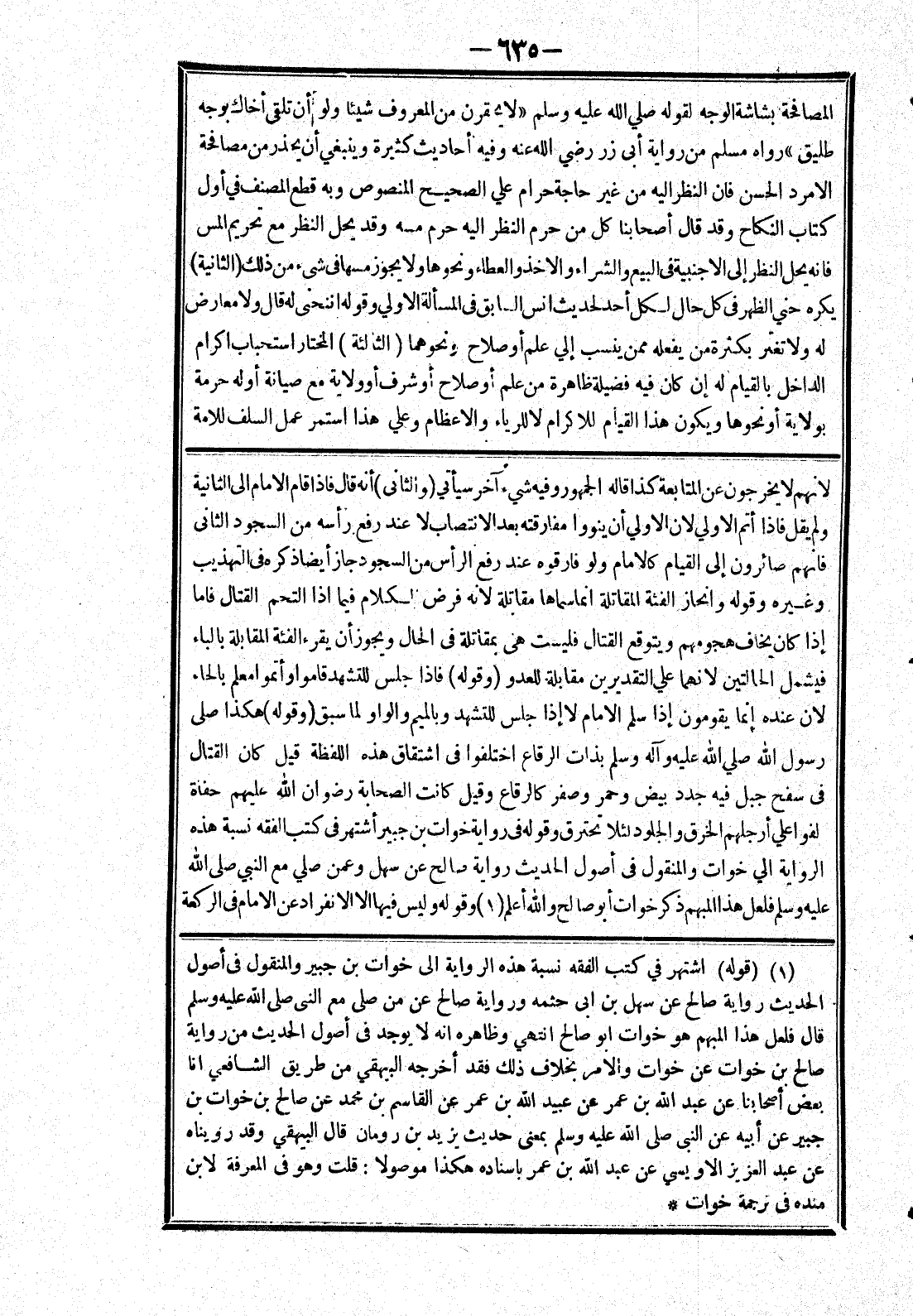 لانهم لا يخرجون عن المتابعة كذا قاله الجمهور وفيه شئ آخر سيأتي (والثانى) أنه قال فإذا قام الامام إلى الثانية ولم يقل فإذا أتم الاولي لان الاولي أن ينووا مفارقته بعد الانتصاب لا عند رفع رأسه من السجود الثاني فانهم صائرون إلى القيام كالامام ولو فارقوه عند رفع الرأس من السجود جاز أيضا ذكره في التهذيب وغيره وقوله وانحاز الفئة المقاتلة انما سماها مقاتلة لانه فرض الكلام فيما إذا التحم القتال فاما إذا كان يخاف هجومهم ويتوقع القتال فليست هي بمقاتلة في الحال ويجوز أن يقرء الفئة المقابلة بالباء فيشمل الحالتين لانهما علي التقديرين مقابلة للعدو (وقوله) فإذا جلس للتشهد قاموا وأتموا معلم بالحاء لان عنده إنما يقومون إذا سلم الامام لا إذا جلس للتشهد وبالميم والواو لما سبق (وقوله) هكذا صلى رسول الله صلي الله عليه وسلم بذات الرقاع اختلفوا في اشتقاق هذه اللفظة قيل كان القتال في سفح جبل فيه جدد بيض وحمر وصفر كالرقاع وقيل كانت الصحابة رضوان الله عليهم حفاة لفوا علي أرجلهم الخرق والجلود لئلا تحترق وقوله في رواية خوات بن جبير أشتهر في كتب الفقه نسبة هذه الرواية الي خوات والمنقول في أصول الحديث رواية صالح عن سهل وعمن صلي مع النبي صلى الله عليه وسلم فلعل هذا المبهم ذكر خوات أبو صالح والله أعلم وقوله وليس فيها الا الانفراد عن الامام في الركعة
