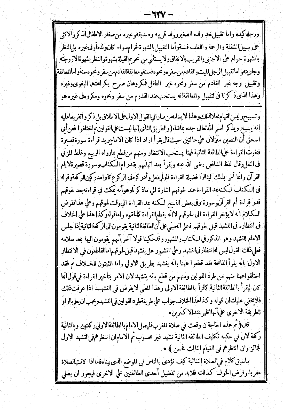 اسحق أن النصين منزلان علي حالتين حيث قال يقرأ اراد إذا كان الامام يريد قراءة سورة قصيرة فتفوت القراءة علي الطائفة الثانية فهنا يستحب الانتظار ومنهم من قطع بما رواه الربيع وغلط المزني في النقل وقال لفظ الشافعي رضى الله عنه ويقرأ بعد اتيانهم بقدر ام الكتاب وسورة قصيرة لا بام القرآن وانما أمر بذلك لينالوا فضيلة القراءة فلو لم يفعل وأدركوه في الركوع كانوا مدركين للركعة وقوله في الكتاب لكنه يمد القراءة عند لحوقهم اشارة الي ما ذكرنا وهو أنه يمكث في قراءته بعد لحوقهم قدر قراءة أم القرآن وسورة وفى بعض النسخ لكنه يمد القراءة الي وقت لحوقهم وعلي هذا ففرض الكلام انه لا يؤخر القراءة إلى لحوقهم لا انه يقطع القراءة كما لحقوه واما قوله وكذا هذا علي الخلاف في انتظاره في التشهد قبل لحوقهم فاعلم انه مبني على أن الطائفة الثانية يقومون إلى الركعة الثانية إذا جلس الامام للتشهد وهو المذكور في الكتاب والمشهور وقد حكينا قولا آخر أنهم يقومون إليها بعد سلامه فعلي ذلك القول ليس له انتظار في التشهد وعلي المشهور هل يتشهد قبل لحوقهم اما القاطعون في الانتظار الاول بانه يقرأ الفاتحة فقد قطعوا ههنا بانه يتشهد بطريق الاولي واما المثبتون للخلاف ثم فقد اختلقوا ههنا منهم من طرد القولين ومنهم من قطع بانه يتشهد لان الامر بتأخير القراءة في قول انما كان ليقرأ بالطائفة الثانية كما قرأ بالطائفة الاولى وهذا المعنى لا يفرض في التشهد إذا عرفت ذلك فلا يخفي عليك ان قوله وكذا هذا الخلاف وجواب علي طريقة طرد القولين في التشهد ويجب ان يعلم بالواو للطريقة الاخرى على أنها اظهر عند الاكثرين * قال (ثم هذه الحاجة ان وقعت في صلاة المغرب فليصل الامام بالطائفة الاولي ركعتين وبالثانية ركعة لان في عكسه تكليف الطائفة الثانية تشهد غير محسوب ثم الامام ان انتظرهم في التشهد الاول فجائز وان انتظرهم في القيام الثالث فحسن) * ما سبق كلام في الصلاة الثنائية كيف تؤدى بالناس في الموضع الذى بيناه فاما إذا كانت الصلاة معربا وفرض الخوف كذلك فلا بد من تفصيل أحدى الطائفتين علي الاخرى فيجوز ان يصلي