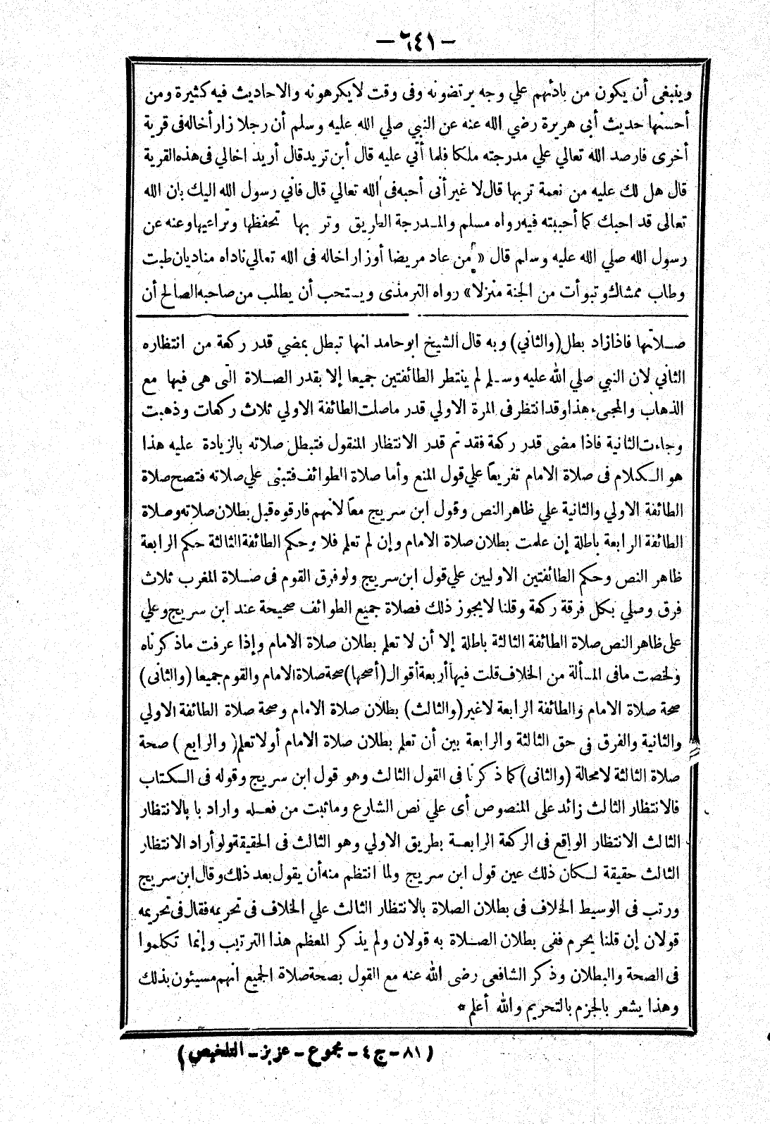 صلاتها فإذا زاد بطل (والثاني) وبه قال الشيخ أبو حامد انها تبطل بمضي قدر ركعة من انتظاره الثاني لان النبي صلي الله عليه وسلم لم ينتظر الطائفتين جميعا إلا بقدر الصلاة التى هي فيها مع الذهاب والمجئ هذا وقد انتظر في المرة الاولي قدر ما صلت الطائفة الاولي ثلاث ركعات وذهبت وجاءت الثانية فإذا مضى قدر ركعة فقد تم قدر الانتظار المنقول فتبطل صلاته بالزيادة عليه هذا هو الكلام في صلاة الامام تفريعا علي قول المنع وأما صلاة الطوائف فتبنى علي صلاته فتصح صلاة