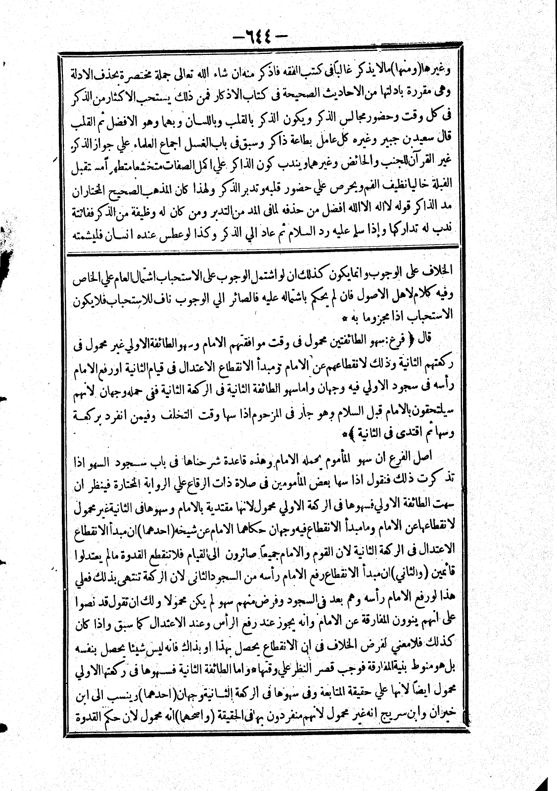 قال (فرع: سهو الطائفتين محمول في وقت موافقتهم الامام وسهو الطائفة الاولي غير محمول في ركعتهم الثانية وذلك لانقطاعهم عن الامام ومبدأ الانقطاع الاعتدال في قيام الثانية أو رفع الامام رأسه في سجود الاولي فيه وجهان واما سهو الطائفة الثانية في الركعة الثانية ففى حمله وجهان لانهم سيلتحقون بالامام قبل السلام وهو جار في المزحوم إذا سها وقت التخلف وفيمن انفرد بركعة وسها ثم اقتدى في الثانية) * اصل الفرع ان سهو المأموم يحمله الامام وهذه قاعدة شرحناها في باب سجود السهو إذا تذكرت ذلك فنقول إذا سها بعض المأمومين في صلاة ذات الرقاع علي الرواية المختارة فينظر ان سهت الطائفة الاولي فسهوها في الركعة الاولي محمول لانها مقتدية بالامام وسهوها في الثانية غير محمول لانقطاعها عن الامام وما مبدأ الانقطاع فيه وجهان حكاهما الامام عن شيخه (احدهما) ان مبدأ الانقطاع الاعتدال في الركعة الثانية لان القوم والامام جميعا صائرون إلى القيام فلا تنقطع القدوة ما لم يعتدلوا قائمين (والثاني) ان مبدأ الانقطاع رفع الامام رأسه من السجود الثاني لان الركعة تنتهى بذلك فعلي هذا لو رفع الامام رأسه وهم بعد في السجود وفرض منهم سهو لم يكن محمولا ولك ان تقول قد نصوا على انهم ينوون المفارقة عن الامام وانه يجوز عند رفع الرأس وعند الاعتدال كما سبق وإذا كان كذلك فلا معني لفرض الخلاف في ان الانقطاع يحصل بهذا أو بذاك فانه ليس شيئا يحصل بنفسه بل هو منوط بنية المفارقة فوجب قصر النظر علي وقتها * واما الطائفة الثانية فسهوها في ركعتها الاولي محمول ايضا لانها علي حقيقة المتابعة وفى سهوها في الركعة الثانية وجهان (احدهما) وينسب إلى ابن خيران وابن سريج انه غير محمول لانهم منفردون بها في الحقيقة (واصحهما) انه محمول لان حكم القدوة