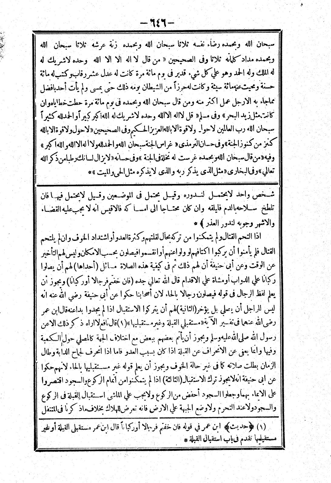 القتال فلم يأمنوا أن يركبوا اكتافهم لو ولوا عنهم أو انقسموا فيصلون بحسب الامكان وليس لهم التأخير عن الوقت وعن أبى حنيفة أن لهم ذلك ثم في كيفية هذه الصلاة مسائل (أحداها) لهم أن يصلوا ركبانا علي الدواب أو مشاة علي الاقدام قال الله تعالي جده (فان خفتم فرجالا أو ركبانا) ويجوز أن يعلم لفظ الرجال في قوله فيصلون رجالا بالحاء لان أصحابنا حكوا عن أبى حنيفة رضي الله عنه انه ليس للراجل أن يصلي بل يؤخر (الثانية) لهم أن يتركوا الاستقبال إذا لم يجدوا بدا عنه قال ابن عمر رضى الله عنهما في تفسير الآية " مستقبلي القبلة وغير مستقبليها " قال نافع لا اراه ذكر ذلك الا عن رسول الله صلى الله عليه وسلم ويجوز أن يأتم بعضهم ببعض مع اختلاف الجهة كالمصلي حول الكعبة وفيها وانما يعفى عن الانحراف عن القبلة إذا كان بسبب العدو فاما إذا انحرف لجماح الدابة وطال الزمان بطلت صلاته كما في غير حالة الخوف ويجوز أن يعلم قوله غير مستقبليها بالحاء لانهم حكوا عن ابى حنيفة انه لا يجوز ترك الاستقبال (الثالثة) إذا لم يتمكنوا من اتمام الركوع والسجود اقتصروا على الايماء بهما وجعلوا السجود أحفض من الركوع ولا يجب علي الماشي استقبال القبلة في الركوع والسجود ولا عند التحرم ولا وضع الجبهة علي الارض فانه تعرض للهلاك بخلاف ما ذكرنا في المتنفل