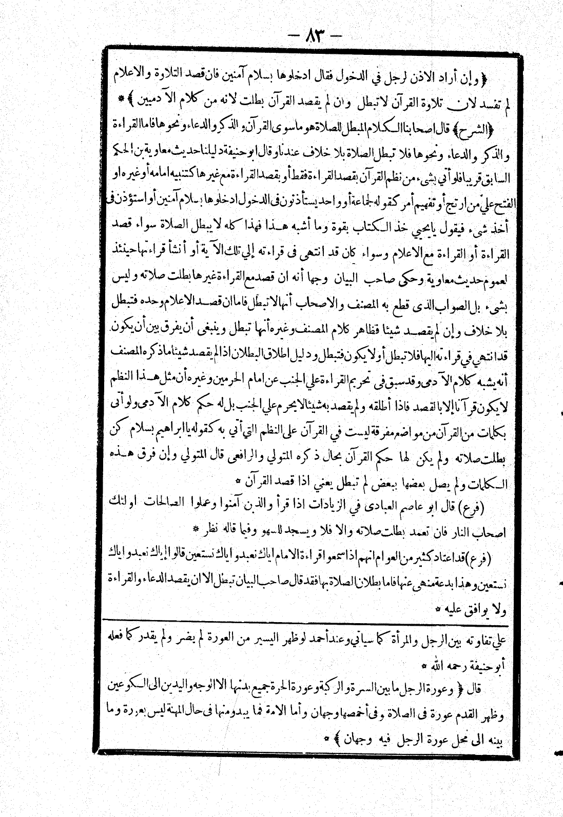 علي تفاوته بين الرجل والمرأة كما سيأتي وعند أحمد لو ظهر اليسير من العورة لم يضر ولم يقدر كما فعله أبو حنيفة رحمه الله * قال (وعورة الرجل ما بين السرة والركبة وعورة الحرة جميع بدنها الا الوجه واليدين إلى الكوعين وظهر القدم عورة في الصلاة وفى أخمصها وجهان أما الامة فما يبدو منها في حال المهنة ليس بعورة وما هو عورة من الرجل فو عورة منها وما بينهما) *