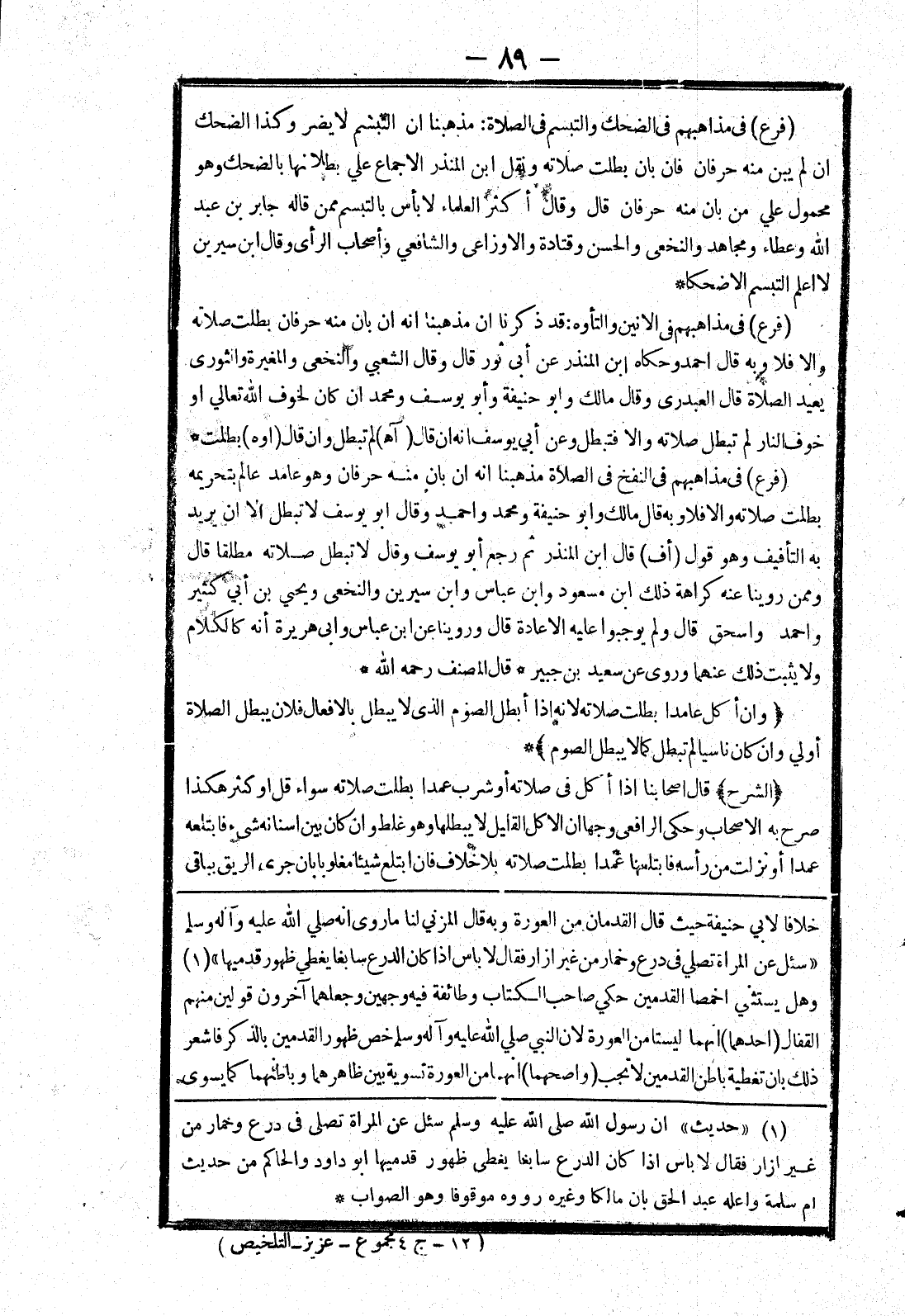 خلافا لابي حنيفة حيث قال القدمان من العورة وبه قال المزني لنا ما روى صلي الله عليه وسلم " سئل عن المرأة تصلي في درع وخمار من غير ازار فقال لا باس إذا كان الدرع سابغا يغطي ظهور قدميها " وهل يستثني اخمصا القدمين حكي صاحب الكتاب وطائفة فيه وجهين وجعلهما آخرون قولين منهم