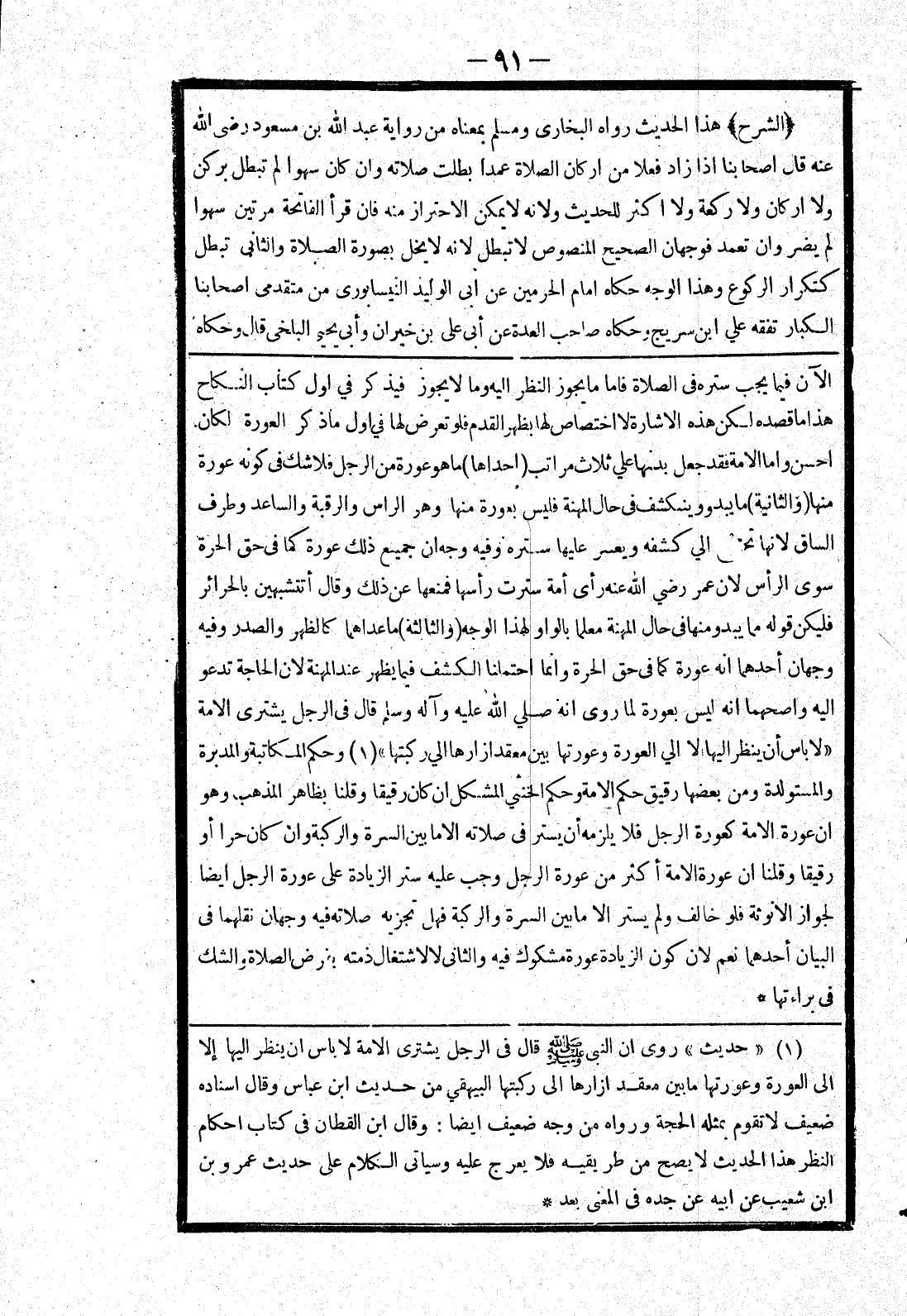 الآن فيما يجب ستره في الصلاة فاما ما يجوز النظر إليه وما لا يجوز فيذكر في اول كتاب النكاح هذا ما قصده لكن هذه الاشارة لا اختصاص لها بظهر القدم فلو تعرض لها في اول ما ذكر العورة لكان احسن واما الامة فقد جعل بدنها على ثلاث مراتب (احداها) ما هو عورة من الرجل فلا شك في كونه عورة منها (والثانية) ما يبدو وينكشف في حال المهنة فليس بعورة منها وهو الراس والرقبة والساعد وطرف الساق لانها تحتاج الي كشفه ويعسر عليها ستره وفيه وجه ان جميع ذلك عورة كما في حق الحرة سوى الرأس لان عمر رضي الله عنه رأى أمة سترت رأسها فمنعها عن ذلك وقال أتتشبهين بالحرائر فليكن قوله مما يبدو منها في حال المهنة معلما بالواو لهذا الوجه (والثالثة) ما عداهما كالظهر والصدر وفيه وجهان أحدهما انه عورة كما في حق الحرة وانما احتملنا الشكف فينا يظهر عند المهنة لان الحاجة تدعو إليه واصحهما انه ليس بعورة لما روى انه صلي الله عليه وسلم قال في الرجل يشترى الامة " لا باس أن ينظر إليها الا الي العورة وعورتها بين معقد ازارها الي ركبتها " وحكم المكاتبة والمدبرة والمستولدة ومن بعضها رقيق حكم الامة وحكم الخنثي المشكل ان كان رقيقا وقلنا بظاهر المذهب وهو ان عورة الامة كعورة الرجل فلا يلزمه أن يستر في صلاته الا ما بين السرة والركبة وان كان حرا أو رقيقا وقلنا ان عورة الامة أكثر من عورة الرجل وجب عليه ستر الزيادة على عورة الرجل ايضا