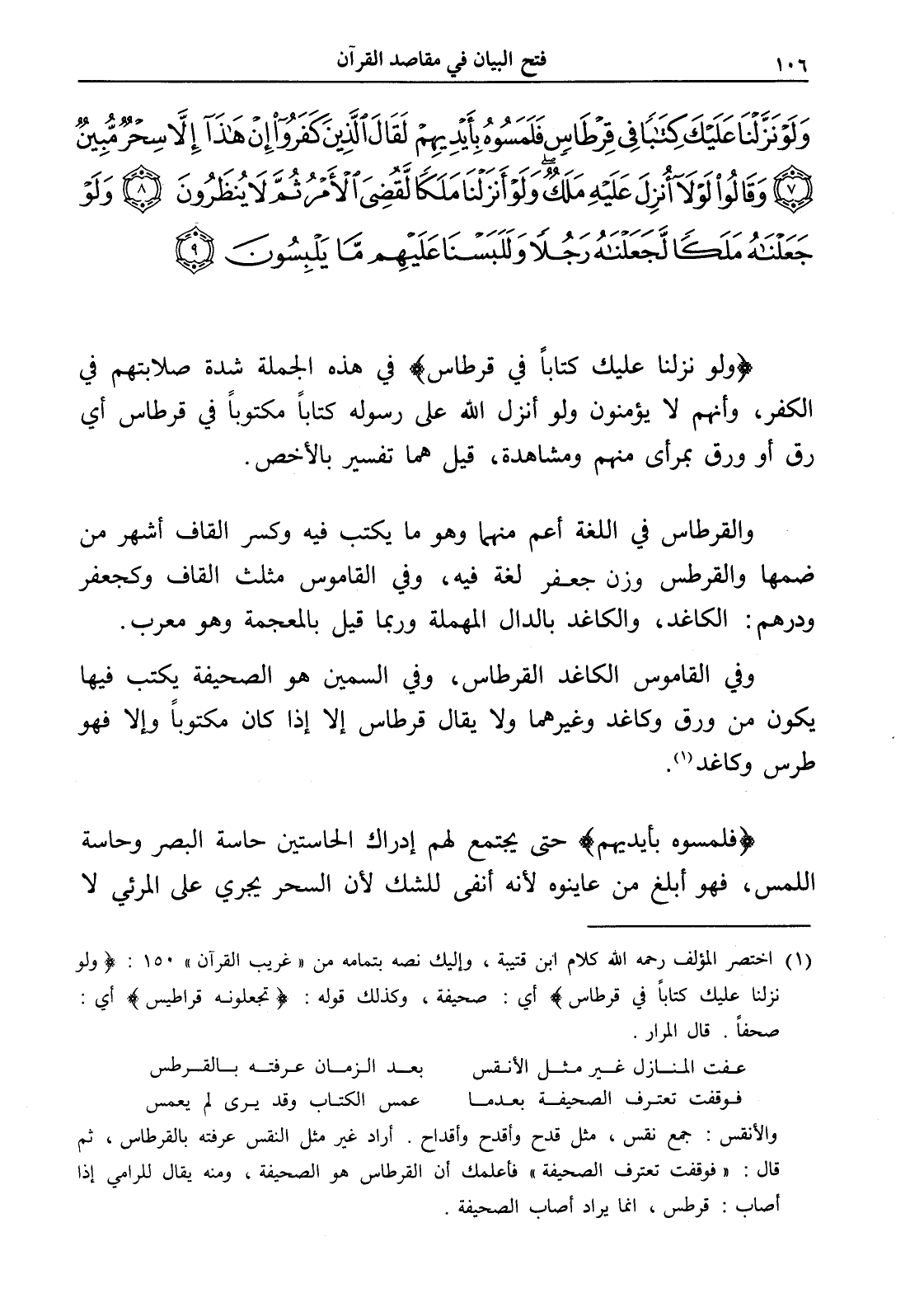 (¬1) اختصر المؤلف رحمه الله كلام ابن قتيبة، وإليك نصه بتمامه من " غريب القرآن " 150: (ولو نزلنا عليك كتاباً في قرطاس) أي: صحيفة، وكذلك قوله: (تجعلونه قراطيس) أي: صحفاً. قال المرار.