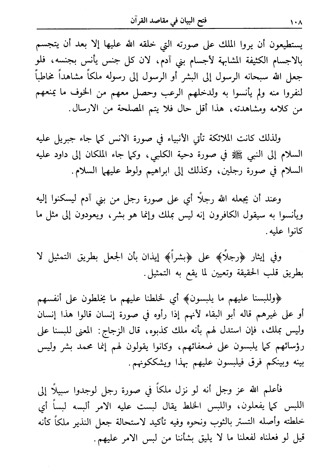 ولذلك كانت الملائكة تأتي الأنبياء في صورة الإنس كما جاء جبريل عليه السلام إلى النبي - صلى الله عليه وسلم - في صورة دحية الكلبي، وكما جاء الملكان إلى داود عليه السلام في صورة رجلين، وكذلك إلى إبراهيم ولوط عليهما السلام.