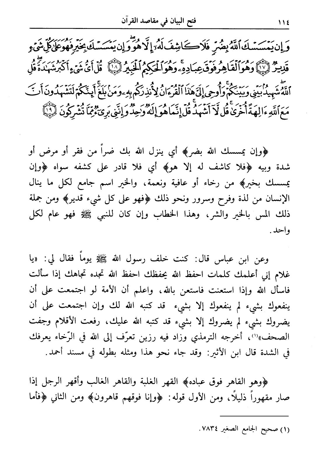 وَإِنْ يَمْسَسْكَ اللَّهُ بِضُرٍّ فَلَا كَاشِفَ لَهُ إِلَّا هُوَ وَإِنْ يَمْسَسْكَ بِخَيْرٍ فَهُوَ عَلَى كُلِّ شَيْءٍ قَدِيرٌ (17) وَهُوَ الْقَاهِرُ فَوْقَ عِبَادِهِ وَهُوَ الْحَكِيمُ الْخَبِيرُ (18) قُلْ أَيُّ شَيْءٍ أَكْبَرُ شَهَادَةً قُلِ اللَّهُ شَهِيدٌ بَيْنِي وَبَيْنَكُمْ وَأُوحِيَ إِلَيَّ هَذَا الْقُرْآنُ لِأُنْذِرَكُمْ بِهِ وَمَنْ بَلَغَ أَئِنَّكُمْ لَتَشْهَدُونَ أَنَّ مَعَ اللَّهِ آلِهَةً أُخْرَى قُلْ لَا أَشْهَدُ قُلْ إِنَّمَا هُوَ إِلَهٌ وَاحِدٌ وَإِنَّنِي بَرِيءٌ مِمَّا تُشْرِكُونَ (19)