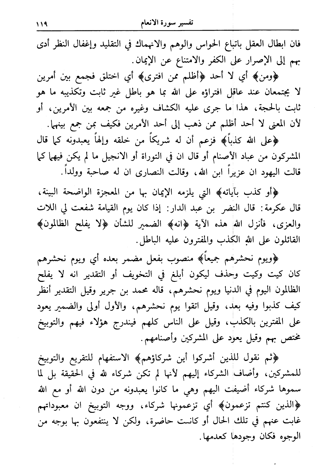 (ويوم نحشرهم جميعاً) منصوب بفعل مضمر بعده أي ويوم نحشرهم كان كيت وكيت وحذف ليكون أبلغ في التخويف أو التقدير أنه لا يفلح الظالمون اليوم في الدنيا ويوم نحشرهم، قاله محمد بن جرير وقيل التقدير أنظر كيف كذبوا وفيه بعد، وقيل اتقوا يوم نحشرهم، والأول أولى والضمير يعود على المفترين بالكذب، وقيل على الناس كلهم فيندرج هؤلاء فيهم والتوبيخ مختص بهم وقيل يعود على المشركين وأصنامهم.