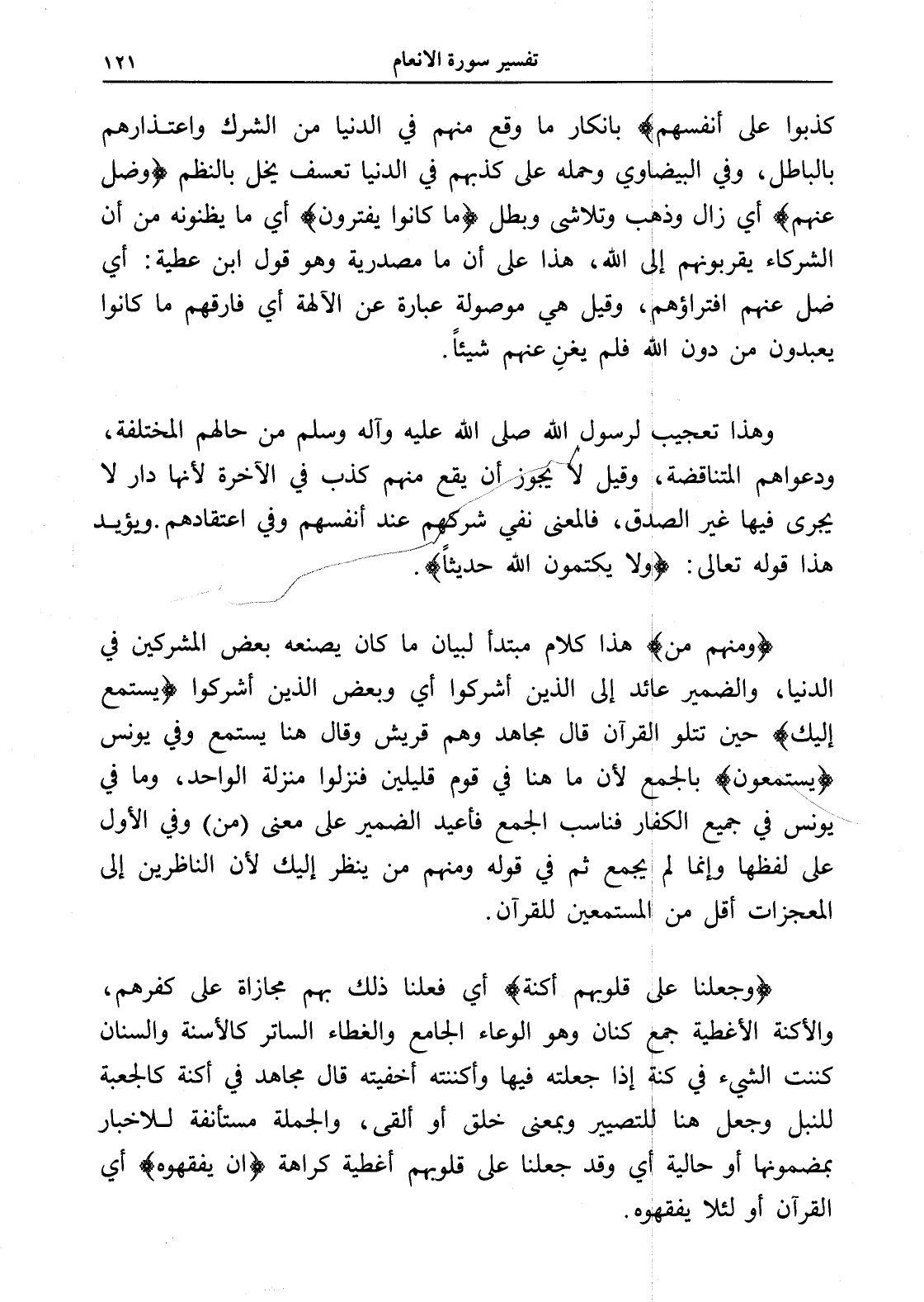 (وجعلنا على قلوبهم أكنة) أي فعلنا ذلك بهم مجازاة على كفرهم، والأكنة الأغطية جمع كنان وهو الوعاء الجامع والغطاء الساتر كالأسنة والسنان كننت الشيء في كنة إذا جعلته فيها وأكننته أخفيته قال مجاهد في أكنة كالجعبة للنبل وجعل هنا للتصيير وبمعنى خلق أو ألقى، والجملة مستأنفة للإخبار بمضمونها أو حالية أي وقد جعلنا على قلوبهم أغطية كراهة (أن يفقهوه) أي القرآن أو لئلا يفقهوه.