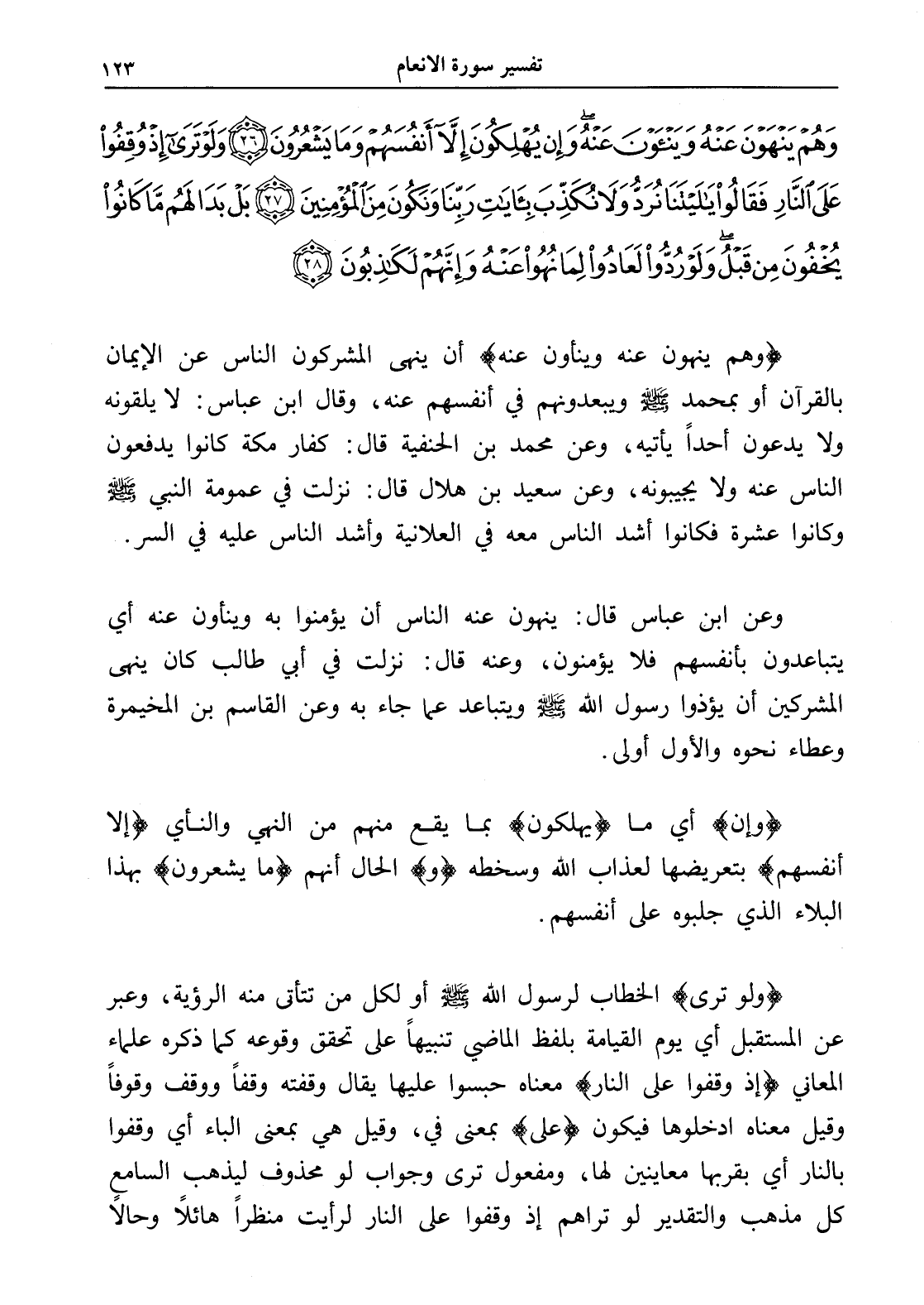 وَهُمْ يَنْهَوْنَ عَنْهُ وَيَنْأَوْنَ عَنْهُ وَإِنْ يُهْلِكُونَ إِلَّا أَنْفُسَهُمْ وَمَا يَشْعُرُونَ (26) وَلَوْ تَرَى إِذْ وُقِفُوا عَلَى النَّارِ فَقَالُوا يَا لَيْتَنَا نُرَدُّ وَلَا نُكَذِّبَ بِآيَاتِ رَبِّنَا وَنَكُونَ مِنَ الْمُؤْمِنِينَ (27) بَلْ بَدَا لَهُمْ مَا كَانُوا يُخْفُونَ مِنْ قَبْلُ وَلَوْ رُدُّوا لَعَادُوا لِمَا نُهُوا عَنْهُ وَإِنَّهُمْ لَكَاذِبُونَ (28)