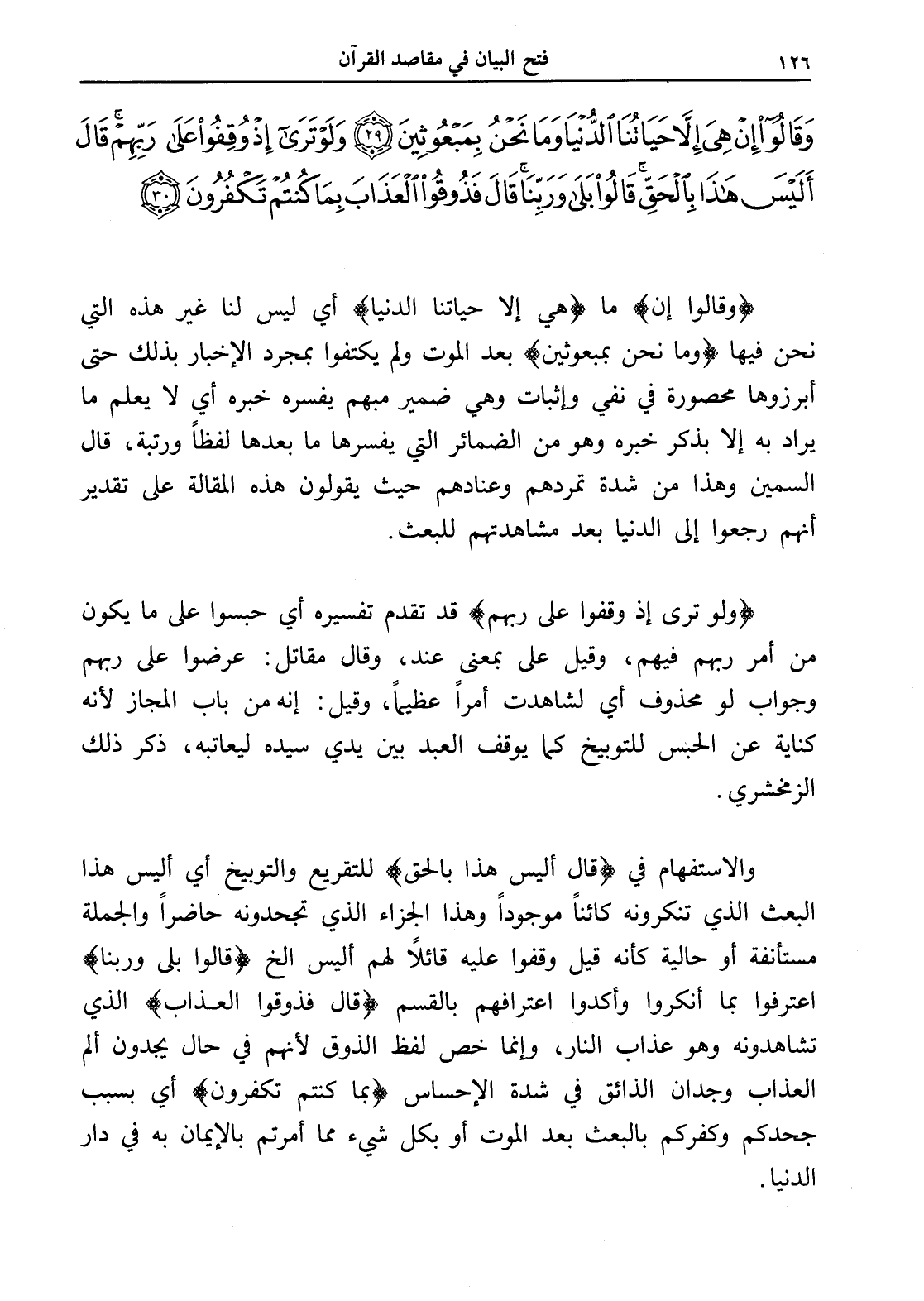 وَقَالُوا إِنْ هِيَ إِلَّا حَيَاتُنَا الدُّنْيَا وَمَا نَحْنُ بِمَبْعُوثِينَ (29) وَلَوْ تَرَى إِذْ وُقِفُوا عَلَى رَبِّهِمْ قَالَ أَلَيْسَ هَذَا بِالْحَقِّ قَالُوا بَلَى وَرَبِّنَا قَالَ فَذُوقُوا الْعَذَابَ بِمَا كُنْتُمْ تَكْفُرُونَ (30)