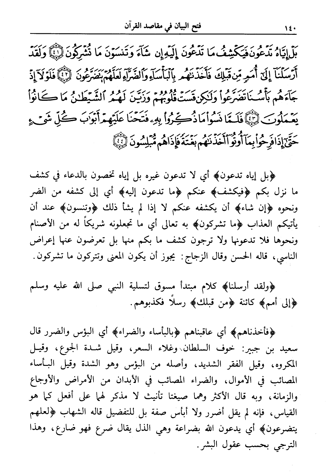 بَلْ إِيَّاهُ تَدْعُونَ فَيَكْشِفُ مَا تَدْعُونَ إِلَيْهِ إِنْ شَاءَ وَتَنْسَوْنَ مَا تُشْرِكُونَ (41) وَلَقَدْ أَرْسَلْنَا إِلَى أُمَمٍ مِنْ قَبْلِكَ فَأَخَذْنَاهُمْ بِالْبَأْسَاءِ وَالضَّرَّاءِ لَعَلَّهُمْ يَتَضَرَّعُونَ (42) فَلَوْلَا إِذْ جَاءَهُمْ بَأْسُنَا تَضَرَّعُوا وَلَكِنْ قَسَتْ قُلُوبُهُمْ وَزَيَّنَ لَهُمُ الشَّيْطَانُ مَا كَانُوا يَعْمَلُونَ (43) فَلَمَّا نَسُوا مَا ذُكِّرُوا بِهِ فَتَحْنَا عَلَيْهِمْ أَبْوَابَ كُلِّ شَيْءٍ حَتَّى إِذَا فَرِحُوا بِمَا أُوتُوا أَخَذْنَاهُمْ بَغْتَةً فَإِذَا هُمْ مُبْلِسُونَ (44)