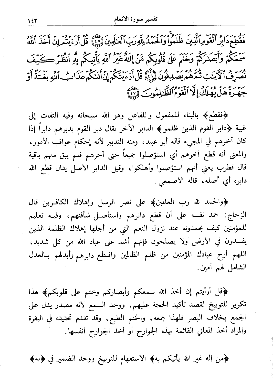 فَقُطِعَ دَابِرُ الْقَوْمِ الَّذِينَ ظَلَمُوا وَالْحَمْدُ لِلَّهِ رَبِّ الْعَالَمِينَ (45) قُلْ أَرَأَيْتُمْ إِنْ أَخَذَ اللَّهُ سَمْعَكُمْ وَأَبْصَارَكُمْ وَخَتَمَ عَلَى قُلُوبِكُمْ مَنْ إِلَهٌ غَيْرُ اللَّهِ يَأْتِيكُمْ بِهِ انْظُرْ كَيْفَ نُصَرِّفُ الْآيَاتِ ثُمَّ هُمْ يَصْدِفُونَ (46) قُلْ أَرَأَيْتَكُمْ إِنْ أَتَاكُمْ عَذَابُ اللَّهِ بَغْتَةً أَوْ جَهْرَةً هَلْ يُهْلَكُ إِلَّا الْقَوْمُ الظَّالِمُونَ (47)