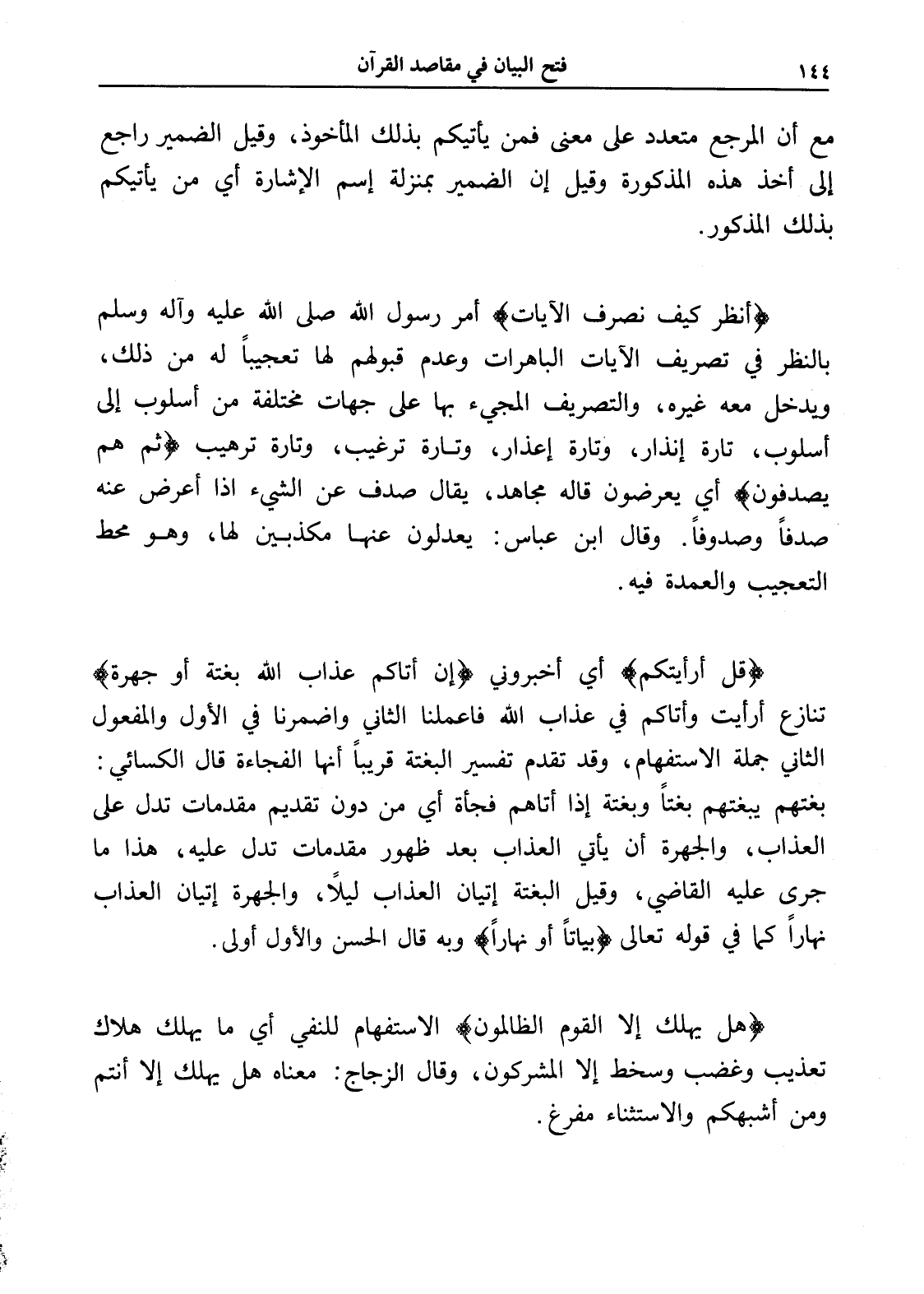 (هل يهلك إلا القوم الظالمون) الاستفهام للنفي أي ما يهلك هلاك تعذيب وغضب وسخط إلا المشركون، وقال الزجاج: معناه هل يهلك إلا أنتم ومن أشبهكم والاستثناء مفرغ.