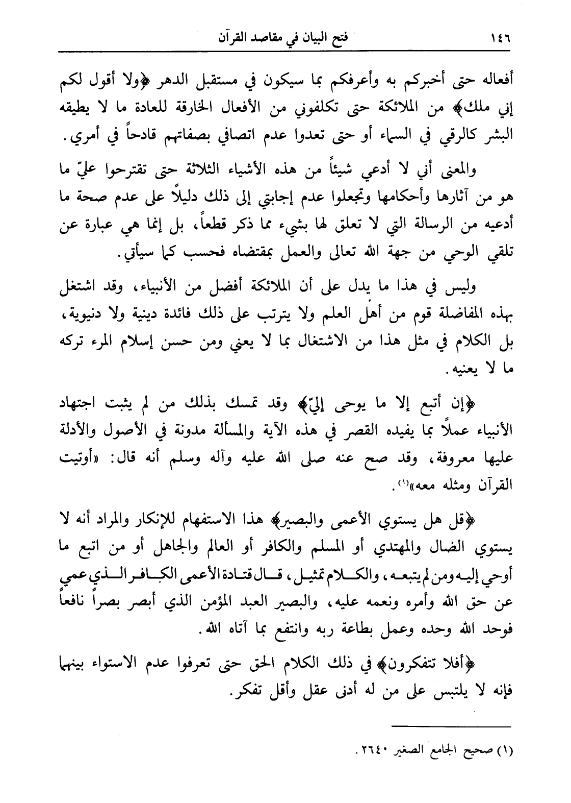 (إن أتبع إلا ما يوحى إليّ) وقد تمسك بذلك من لم يثبت اجتهاد الأنبياء عملاً بما يفيده القصر في هذه الآية والمسألة مدونة في الأصول والأدلة عليها معروفة، وقد صح عنه صلى الله عليه وآله وسلم أنه قال: " أوتيت القرآن ومثله معه " (¬1).