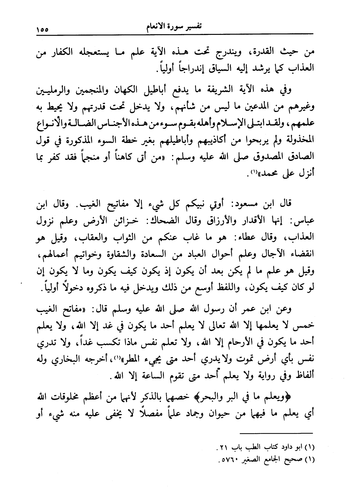 وعن ابن عمر أن رسول الله صلى الله عليه وسلم قال: " مفاتح الغيب خمس لا يعلمها إلا الله تعالى لا يعلم أحد ما يكون في غد إلا الله، ولا يعلم أحد ما يكون في الأرحام إلا الله، ولا تعلم نفس ماذا تكسب غداً، ولا تدري نفس بأي أرض تموت ولا يدري أحد متى يجيء المطر " (¬2)، أخرجه البخاري وله ألفاظ وفي رواية ولا يعلم أحد متى تقوم الساعة إلا الله.