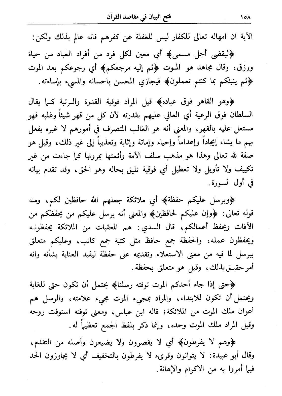 (وهو القاهر فوق عباده) قيل المراد فوقية القدرة والرتبة كما يقال السلطان فوق الرعية أي العالي عليهم بقدرته لأن كل من قهر شيئاً وغلبه فهو مستعل عليه بالقهر، والمعنى أنه هو الغالب المتصرف في أمورهم لا غيره يفعل بهم ما يشاء إيجاداً وإعداماً وإحياء وإماتة وإثابة وتعذيباً إلى غير ذلك، وقيل هو صفة لله تعالى وهذا هو مذهب سلف الأمة وأئمتها يمرونها كما جاءت من غير تكييف ولا تأويل ولا تعطيل أي فوقية تليق بحاله وهو الحق، وقد تقدم بيانه في أول السورة.