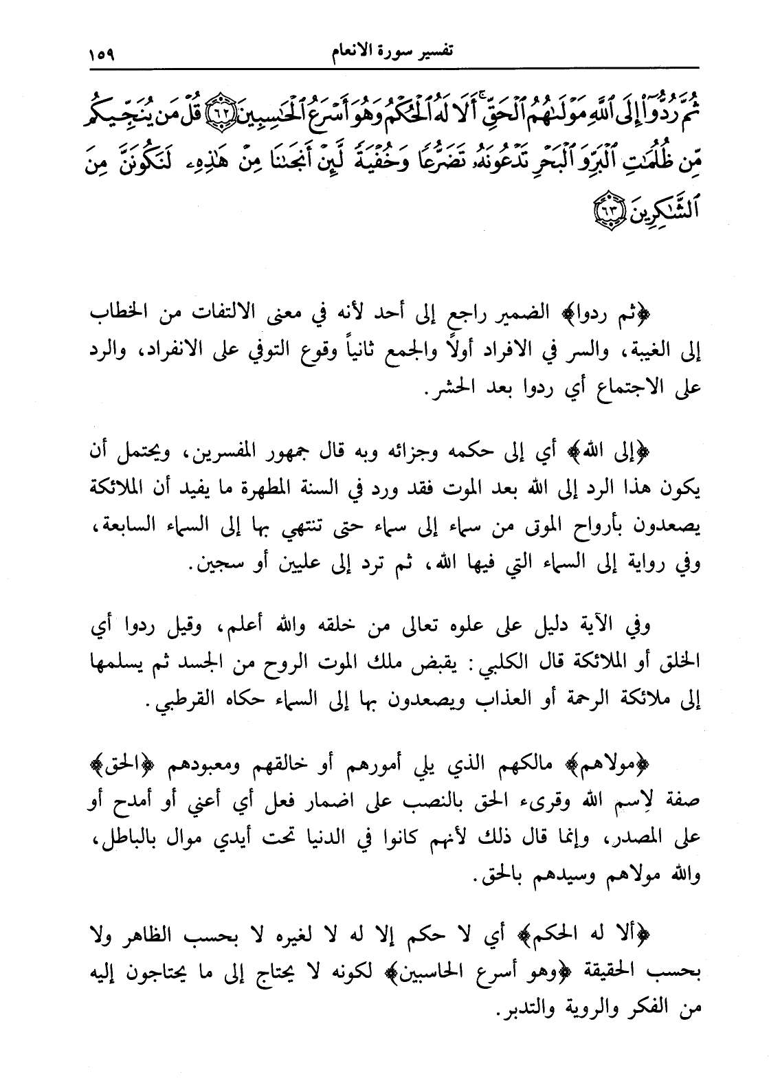 ثُمَّ رُدُّوا إِلَى اللَّهِ مَوْلَاهُمُ الْحَقِّ أَلَا لَهُ الْحُكْمُ وَهُوَ أَسْرَعُ الْحَاسِبِينَ (62) قُلْ مَنْ يُنَجِّيكُمْ مِنْ ظُلُمَاتِ الْبَرِّ وَالْبَحْرِ تَدْعُونَهُ تَضَرُّعًا وَخُفْيَةً لَئِنْ أَنْجَانَا مِنْ هَذِهِ لَنَكُونَنَّ مِنَ الشَّاكِرِينَ (63)