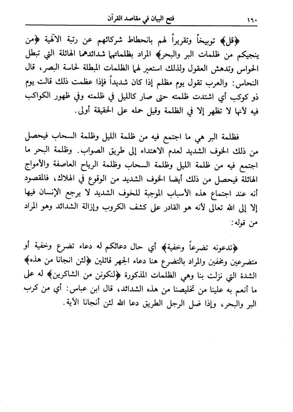 فظلمة البر هي ما اجتمع فيه من ظلمة الليل وظلمة السحاب فيحصل من ذلك الخوف الشديد لعدم الاهتداء إلى طريق الصواب. وظلمة البحر ما اجتمع فيه من ظلمة الليل وظلمة السحاب وظلمة الرياح العاصفة والأمواج الهائلة فيحصل من ذلك أيضاً الخوف الشديد من الوقوع في الهلاك، فالمقصود أنه عند اجتماع هذه الأسباب الموجبة للخوف الشديد لا يرجع الإنسان فيها إلا إلى الله تعالى لأنه هو القادر على كشف الكروب وإزالة الشدائد وهو المراد من قوله: