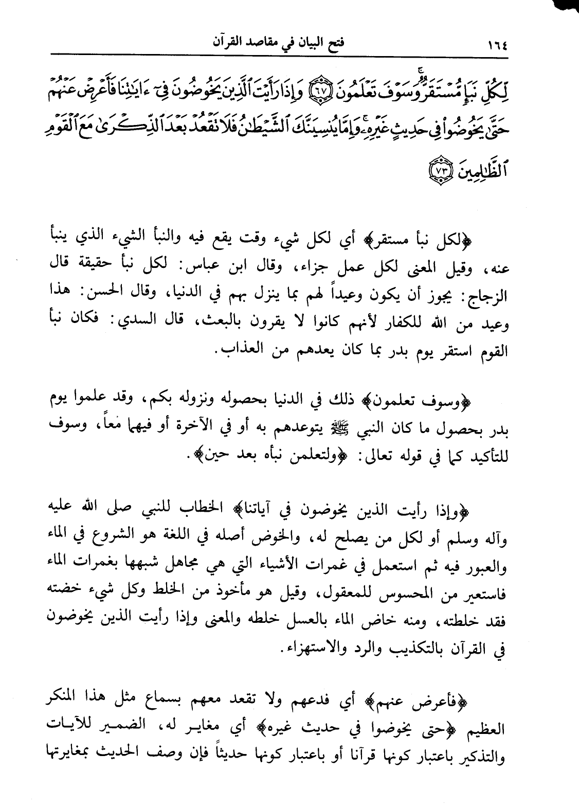 لِكُلِّ نَبَإٍ مُسْتَقَرٌّ وَسَوْفَ تَعْلَمُونَ (67) وَإِذَا رَأَيْتَ الَّذِينَ يَخُوضُونَ فِي آيَاتِنَا فَأَعْرِضْ عَنْهُمْ حَتَّى يَخُوضُوا فِي حَدِيثٍ غَيْرِهِ وَإِمَّا يُنْسِيَنَّكَ الشَّيْطَانُ فَلَا تَقْعُدْ بَعْدَ الذِّكْرَى مَعَ الْقَوْمِ الظَّالِمِينَ (68)