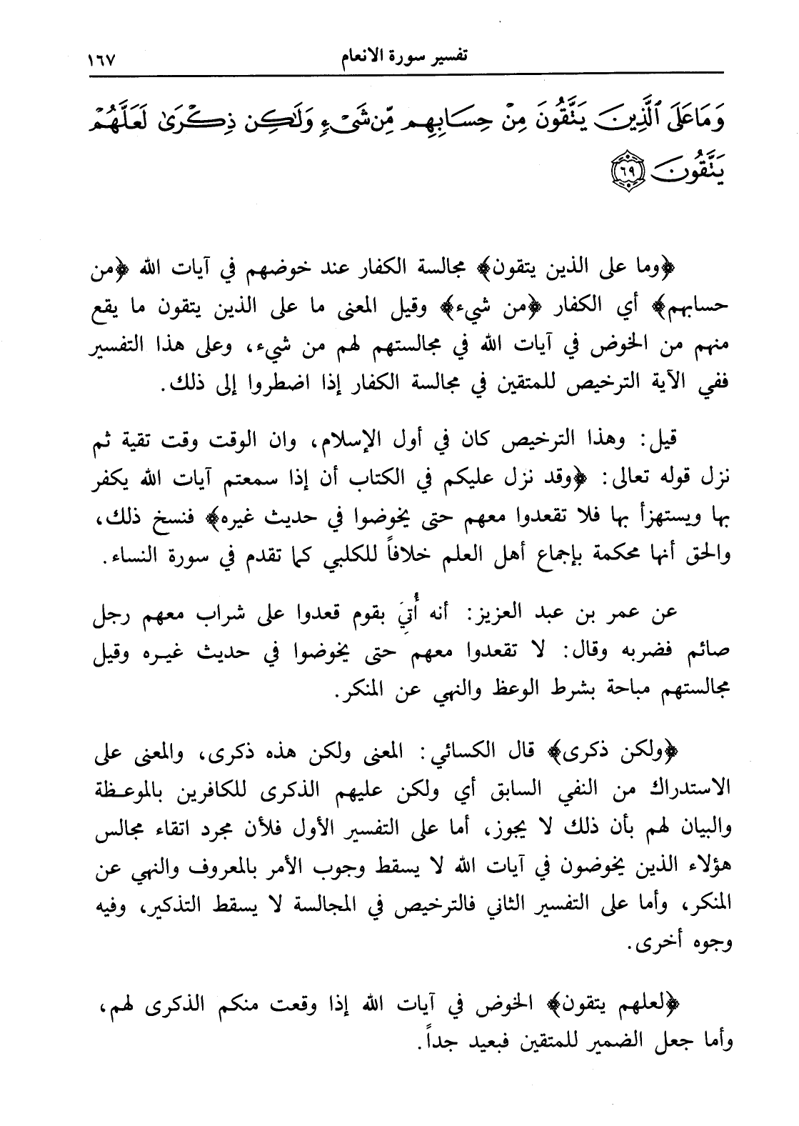 (وما على الذين يتقون) مجالسة الكفار عند خوضهم في آيات الله (من حسابهم) أي الكفار (من شيء) وقيل المعنى ما على الذين يتقون ما يقع منهم من الخوض في آيات الله في مجالستهم لهم من شيء، وعلى هذا التفسير ففي الآية الترخيص للمتقين في مجالسة الكفار إذا اضطروا إلى ذلك.