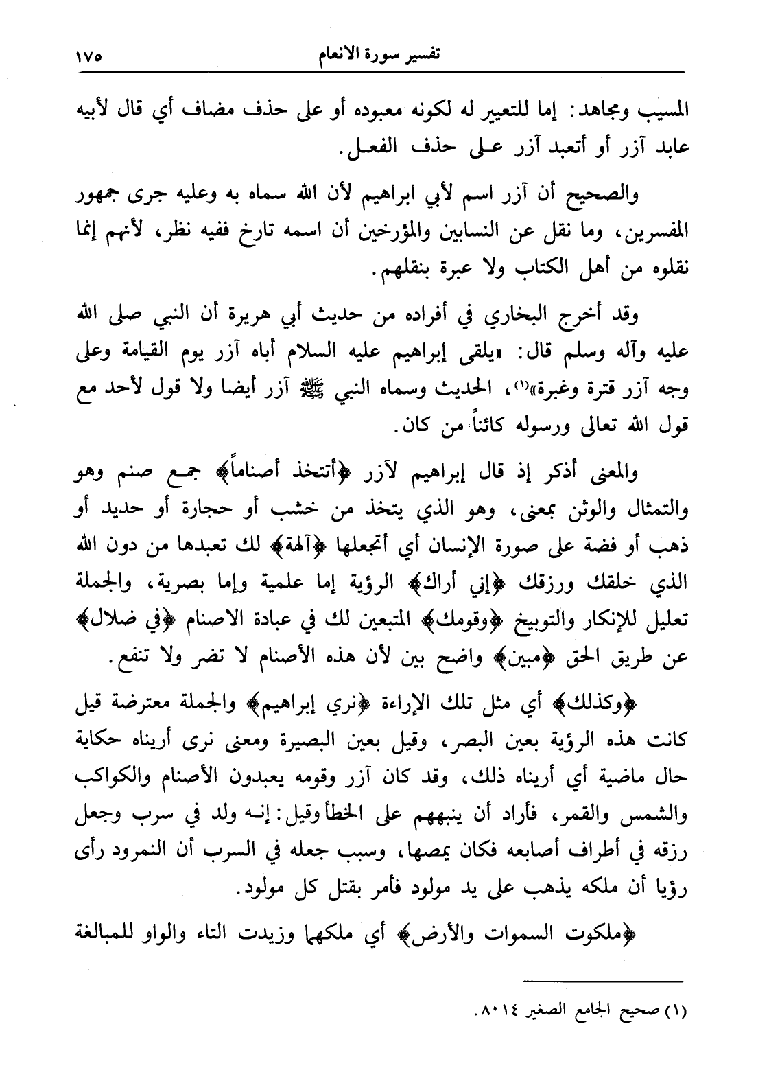 وقد أخرج البخاري في أفراده من حديث أبي هريرة أن النبي صلى الله عليه وآله وسلم قال: " يلقى إبراهيم عليه السلام أباه آزر يوم القيامة وعلى وجه آزر قترة وغبرة " (¬1)، الحديث وسماه النبي - صلى الله عليه وسلم - آزر أيضاً ولا قول لأحد مع قول الله تعالى ورسوله كائناً من كان.