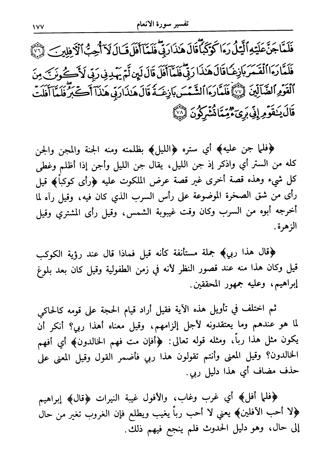 فَلَمَّا جَنَّ عَلَيْهِ اللَّيْلُ رَأَى كَوْكَبًا قَالَ هَذَا رَبِّي فَلَمَّا أَفَلَ قَالَ لَا أُحِبُّ الْآفِلِينَ (76) فَلَمَّا رَأَى الْقَمَرَ بَازِغًا قَالَ هَذَا رَبِّي فَلَمَّا أَفَلَ قَالَ لَئِنْ لَمْ يَهْدِنِي رَبِّي لَأَكُونَنَّ مِنَ الْقَوْمِ الضَّالِّينَ (77) فَلَمَّا رَأَى الشَّمْسَ بَازِغَةً قَالَ هَذَا رَبِّي هَذَا أَكْبَرُ فَلَمَّا أَفَلَتْ قَالَ يَا قَوْمِ إِنِّي بَرِيءٌ مِمَّا تُشْرِكُونَ (78)