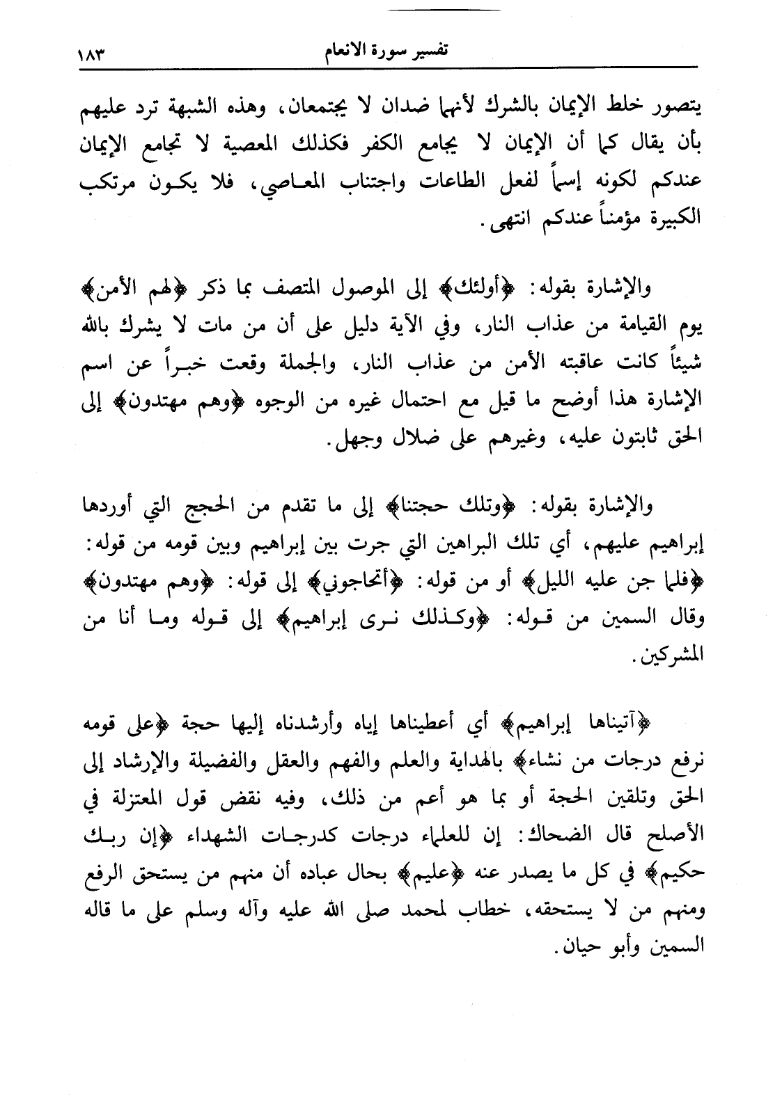 (آتيناها إبراهيم) أي أعطيناها إياه وأرشدناه إليها حجة (على قومه نرفع درجات من نشاء) بالهداية والعلم والفهم والعقل والفضيلة والإرشاد إلى الحق وتلقين الحجة أو بما هو أعم من ذلك، وفيه نقض قول المعتزلة في الأصلح قال الضحاك: إن للعلماء درجات كدرجات الشهداء (إن ربك حكيم) في كل ما يصدر عنه (عليم) بحال عباده أن منهم من يستحق الرفع ومنهم من لا يستحقه، خطاب لمحمد صلى الله عليه وآله وسلم على ما قاله السمين وأبو حيان.