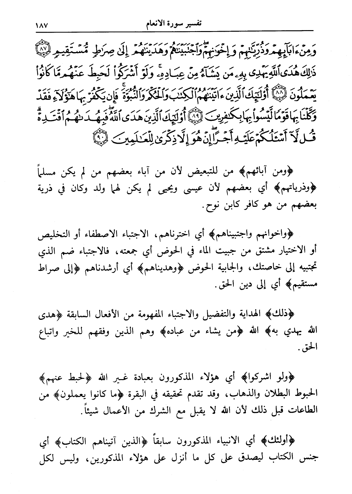 وَمِنْ آبَائِهِمْ وَذُرِّيَّاتِهِمْ وَإِخْوَانِهِمْ وَاجْتَبَيْنَاهُمْ وَهَدَيْنَاهُمْ إِلَى صِرَاطٍ مُسْتَقِيمٍ (87) ذَلِكَ هُدَى اللَّهِ يَهْدِي بِهِ مَنْ يَشَاءُ مِنْ عِبَادِهِ وَلَوْ أَشْرَكُوا لَحَبِطَ عَنْهُمْ مَا كَانُوا يَعْمَلُونَ (88) أُولَئِكَ الَّذِينَ آتَيْنَاهُمُ الْكِتَابَ وَالْحُكْمَ وَالنُّبُوَّةَ فَإِنْ يَكْفُرْ بِهَا هَؤُلَاءِ فَقَدْ وَكَّلْنَا بِهَا قَوْمًا لَيْسُوا بِهَا بِكَافِرِينَ (89) أُولَئِكَ الَّذِينَ هَدَى اللَّهُ فَبِهُدَاهُمُ اقْتَدِهْ قُلْ لَا أَسْأَلُكُمْ عَلَيْهِ أَجْرًا إِنْ هُوَ إِلَّا ذِكْرَى لِلْعَالَمِينَ (90)
